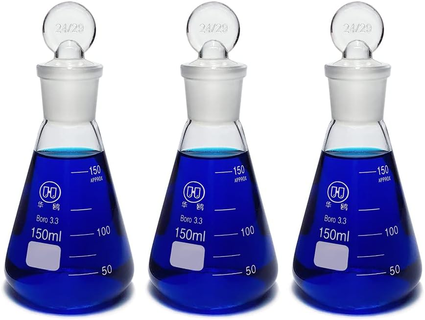 Package contains: 3 pack 50ml conical flasks, each flask with a matching glass stopper, which is more suitable for the analysis of volatile substances and experiments that cannot use cork or rubber stopper.