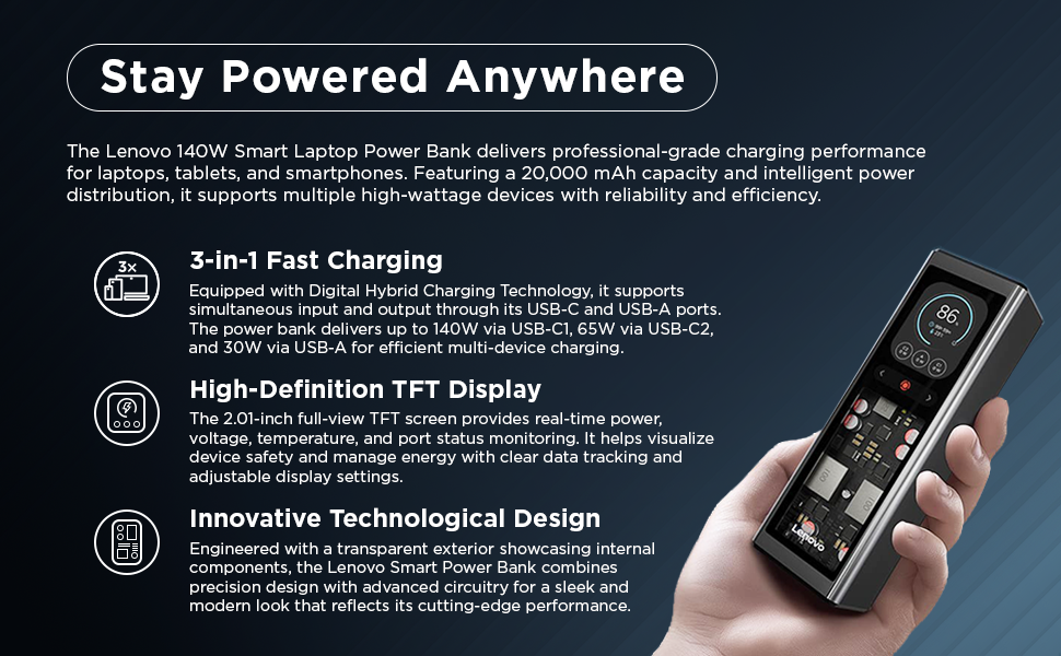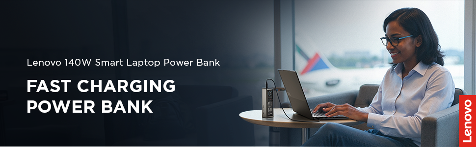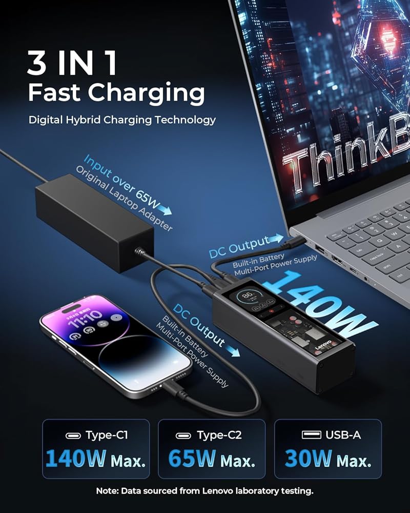 Lenovo 140W Portable Power Bank with 3-Port Digital Hybrid Charger, TFT Display for ThinkBook 14, MacBook, iPhone, Samsung Galaxy, Travel Charging Station with 240W Cable