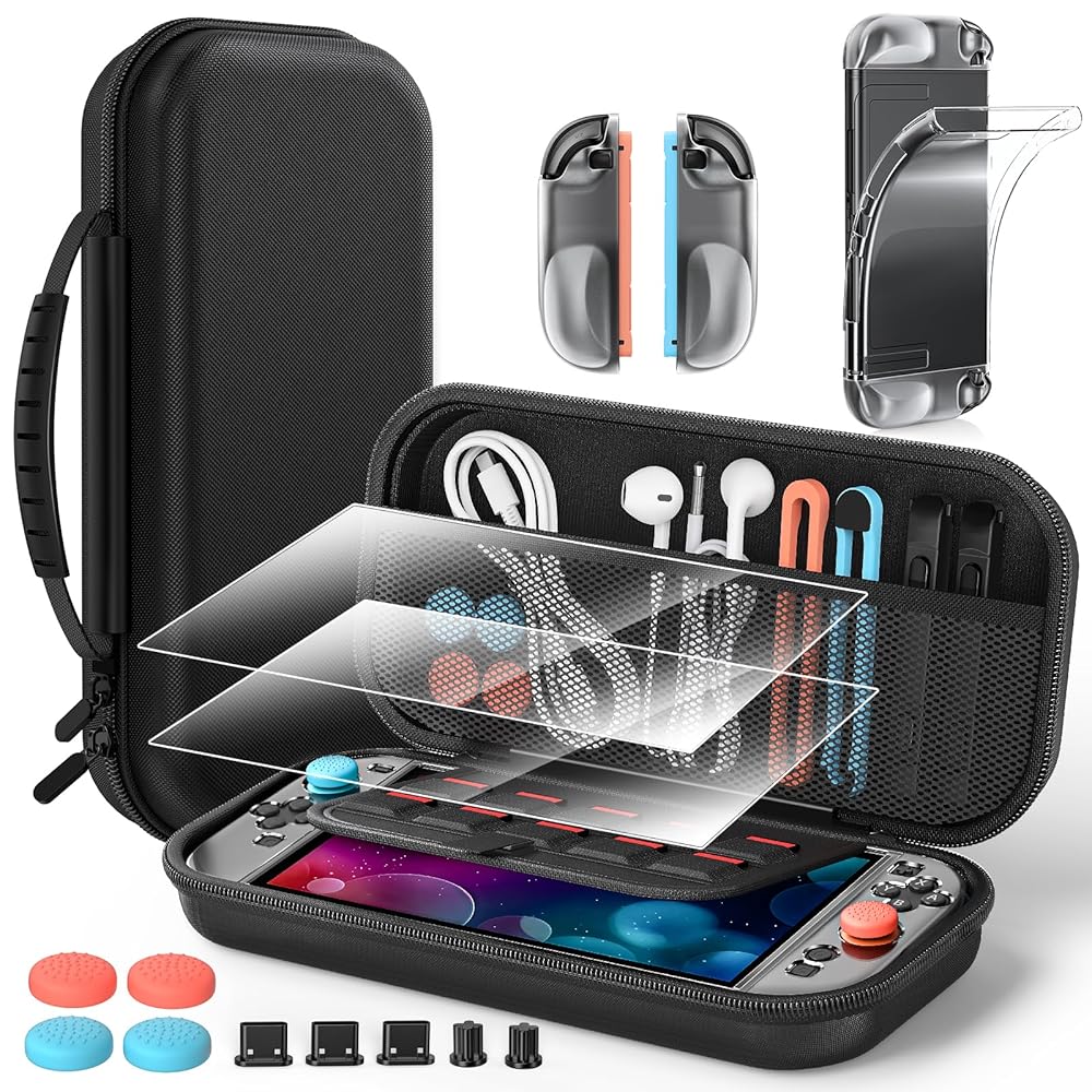 All in 1 Accessories Bundle for Nintendo Switch 2 (2025): Specially designed for the Switch 2 (2025 Model), this lightweight EVA hard shell case offers robust protection and portability with 2 tempered glass screen protectors, dust-proof plug kit, and 4 ergonomic thumb grips for enhanced gameplay. Custom-molded interior secures your console, while the compact design ensures easy travel