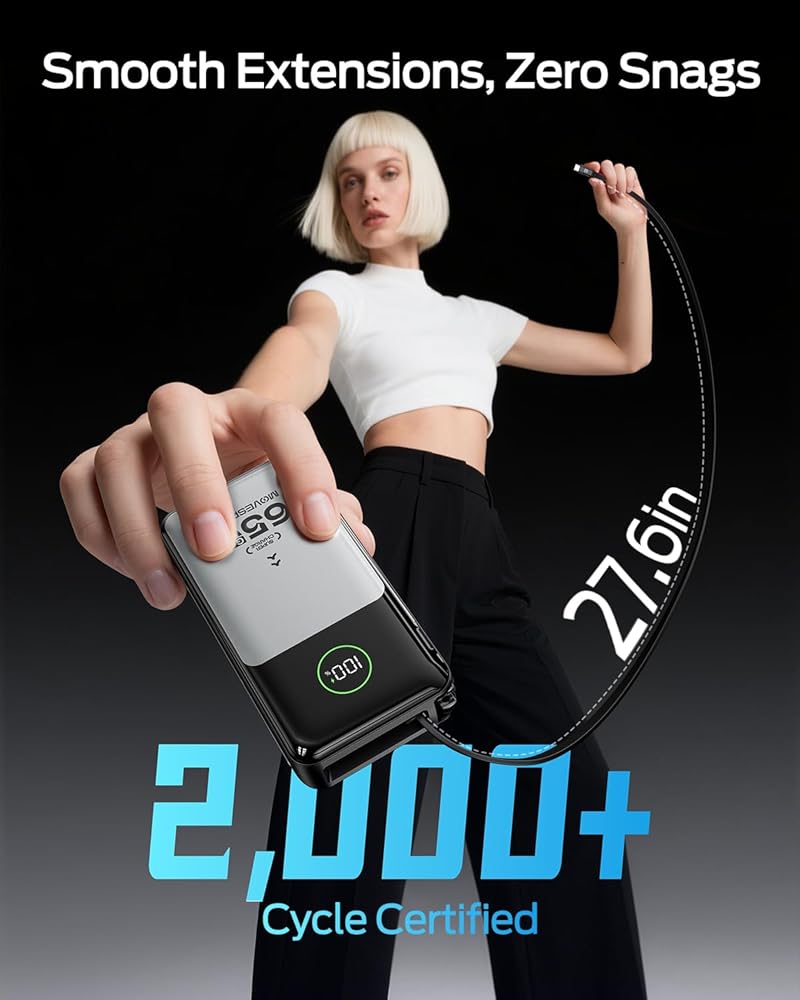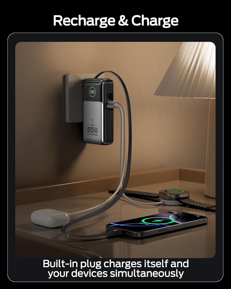 3-in-1 Power Bank - Your all-in-one charging solution! This 20,000mAh power bank features 65W fast charging, a built-in 70cm(27.6in) USB-C cable, and foldable plug. Charge phones anywhere - no extra cables needed. Compact and travel-ready for on-the-go power
