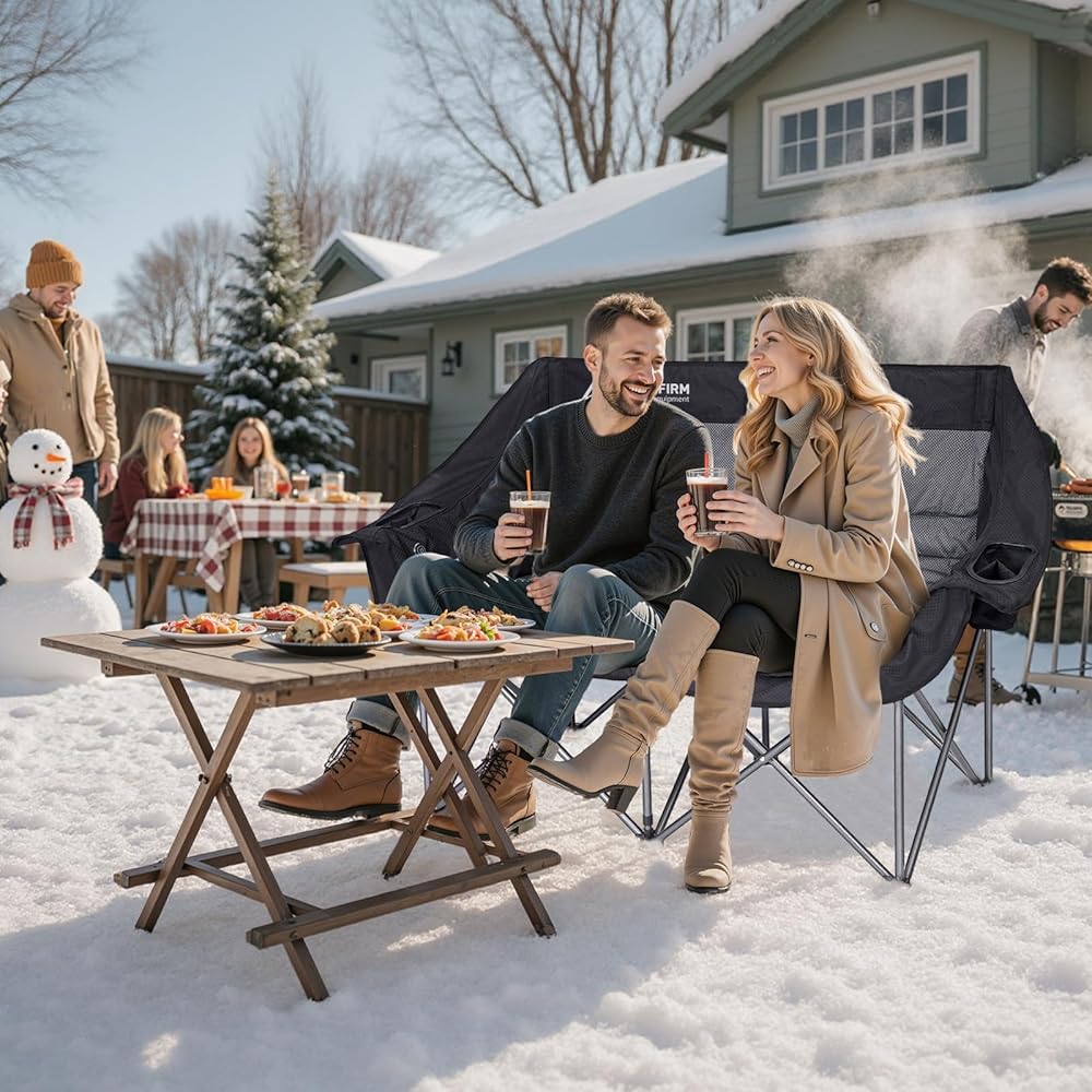 【Comfortable heated chairs for outdoor sports】The double camping chair boasts a spacious 43.3-inch-long and 19.7-inch-wide seating area. Made with 600D jacquard fabric and a durable alloy steel frame, it features a front vertical stabilizing leg and can support up to 650 pounds. The jacquard fabric offers enhanced breathability, significantly improving heating performance, making it perfect for outdoor camping!