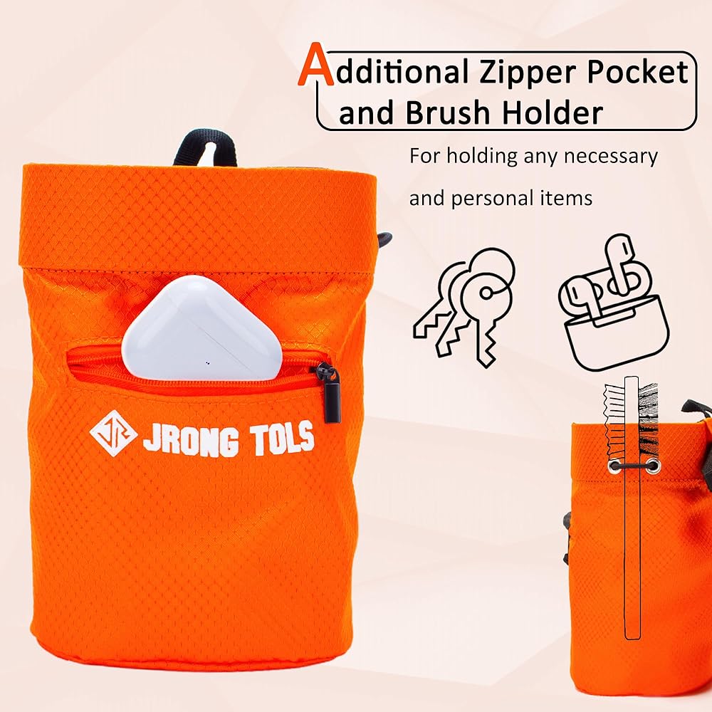 ✔ Spacious Capacity - The opening of cylindrical chalk bag height 19CM, diameter 12CM, wide enough to allow your hand reach in and out to grab the chalk ball without dust overflow scattered; a practical horizontal zippered pocket with a firm metal zipper puller on the front side, enable to store the essential items with you.