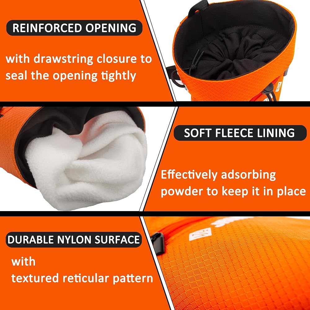 ✔ All-Purpose - Brilliant orange/black chalk bag is stylish and eye-catching, equipped with a functional and adjustable buckle belt for convient carrying; Fit for not only rock climbing and bouldering but wide variety of sports, weightlifting, gymnastics, fitness training and any other workout, perfectly applicable throughout the year.