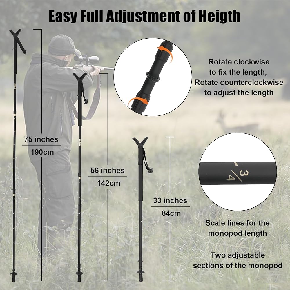 SIMPLE HEIGHT ADJUSTMENT: This monopod has a very simple height adjustment mechanism without any complicated structures. By rotating the rod counterclockwise, you can loosen and adjust the length, and then by rotating the rod clockwise, you can secure the desired length. It has an adjustable height range from 33 inches to 75 inches, making it suitable for shooters of various heights