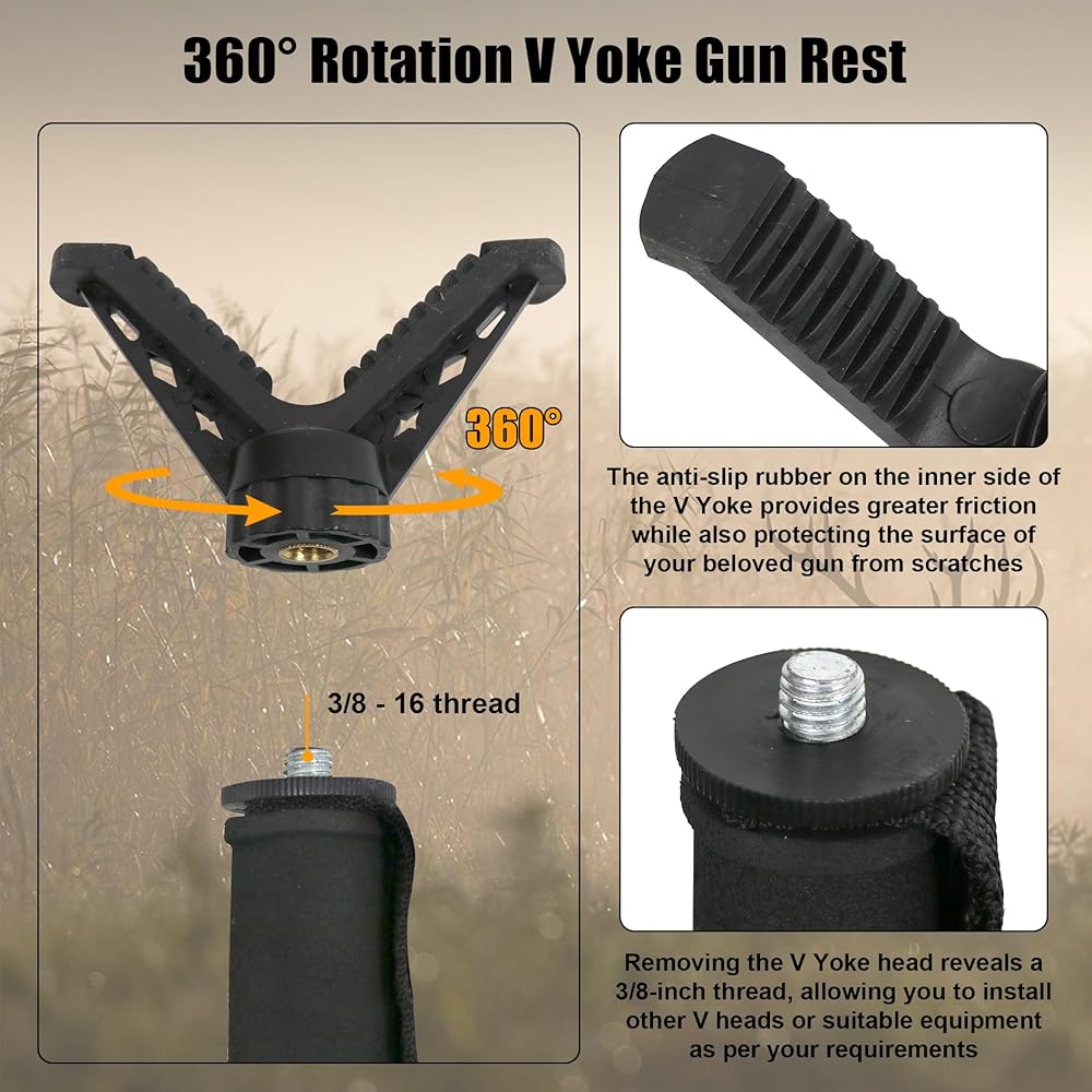REMOVABLE 360° ROTATION V YOKE: The V yoke holder is designed with soft rubber ridge on top, which provides a comfortable grip and effectively prevents your rifle from being scratched. The 360-degree rotation feature allows for quick and accurate shooting. Removed the detachable V yoke head, you can install other compatible devices on this monopod with a 3/8-inch screw mount