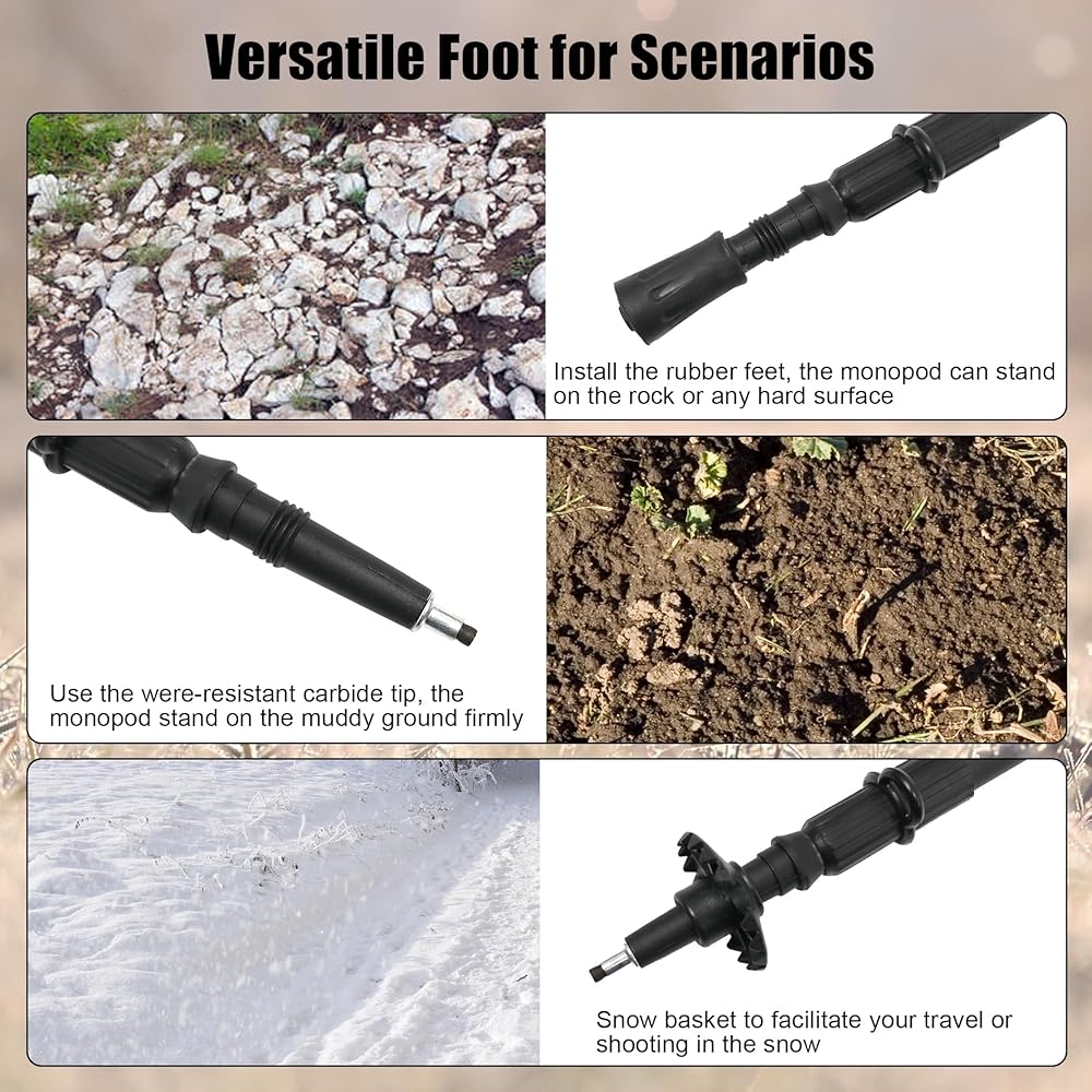 VERSATILE SPIKE FEET: The wear-resistant carbide tip under the rubber footing makes the monopod shooting sticks ideal for standing firmly on any terrain. The retractable steel spikes make it easy to deploy and retract the spike while the rubber feet provide additional stability. Equipped with a snow mat, our shooting sticks are adaptable to more environments, making it perfect for use in outdoor environments such as forests, valleys, water, and fields