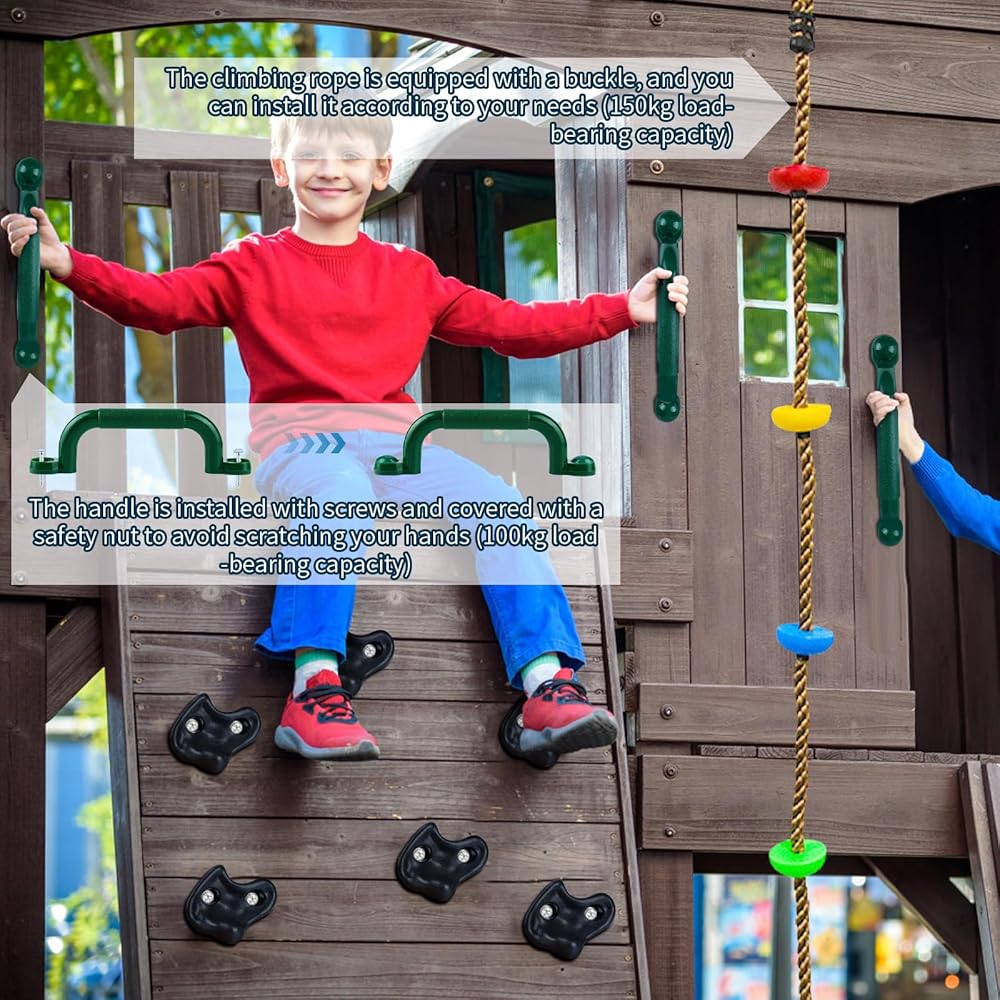 Easy to Install: This climbing wall set contains 10 climbing stones, 1 climbing rope, 1 pair of handles, 1 set of hardware, and a hex wrench for installation. It is suitable for installation on wooden boards with a thickness of less than 2.5 cm, which is very suitable for indoor play and easy to store. Build a climbing wall for your kids and they will be excited when they see it!
