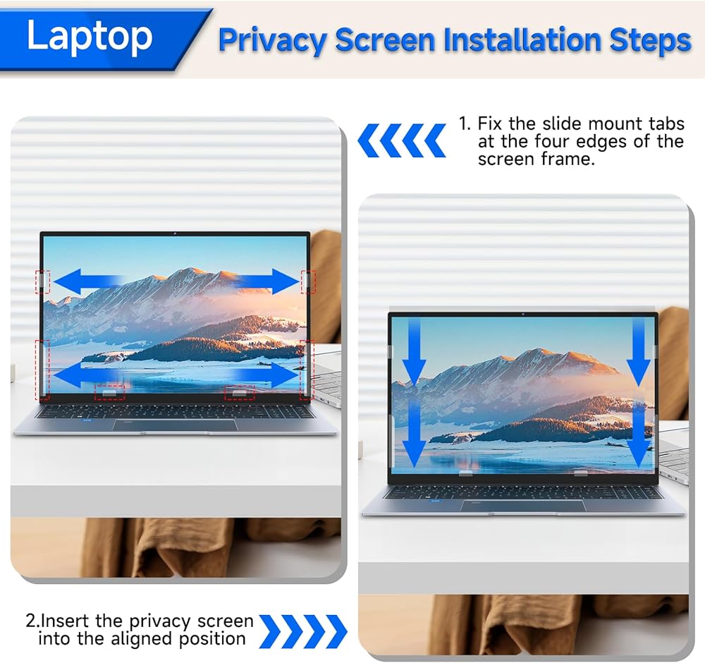 [2 Installation Ways]: Our ZOEGAA privacy screen can be applied to your laptop screen in two ways: 1. Insert installation method. Just follow the installation video to attach the slide mount tabs around the screen border, then insert the 14 inch laptop privacy screen. 2. Double-sided adhesive installation: Our privacy screen for computer will come with double-sided adhesive stickers. You can stick the double-sided adhesive at the four corners of the privacy film, and then attach it to the computer screen. If you think the stickers are not firmly attached, you can apply more double-sided adhesive tapes to ensure a stable attachment.