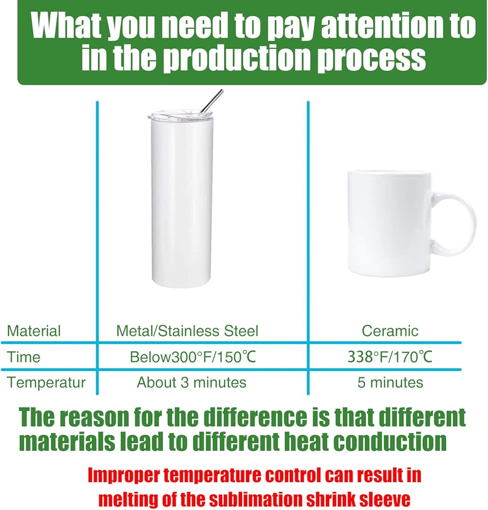【Easy to Use】You just need to cover the sublimation shrink wrap sleeves on mugs, tiles, or other sublimation blanks. Then put them into the oven and design time and wait for the finished products about 300°F(150℃),3 minutes.