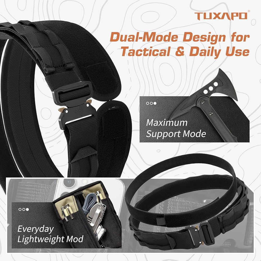 Quick-Release Metal Buckle – Heavy-duty alloy buckle enables instant on/off, corrosion-resistant for rugged use. Features dual-mode design for flexible wearing: 1.Maximum Support Mode: Outer belt + non-slip pad (ideal for heavy loads/tactical use). 2.Everyday Lightweight Mode: Inner belt + outer belt (perfect for daily wear/EDC)