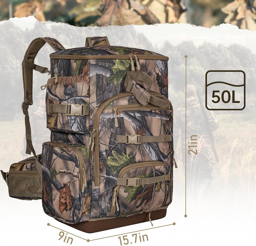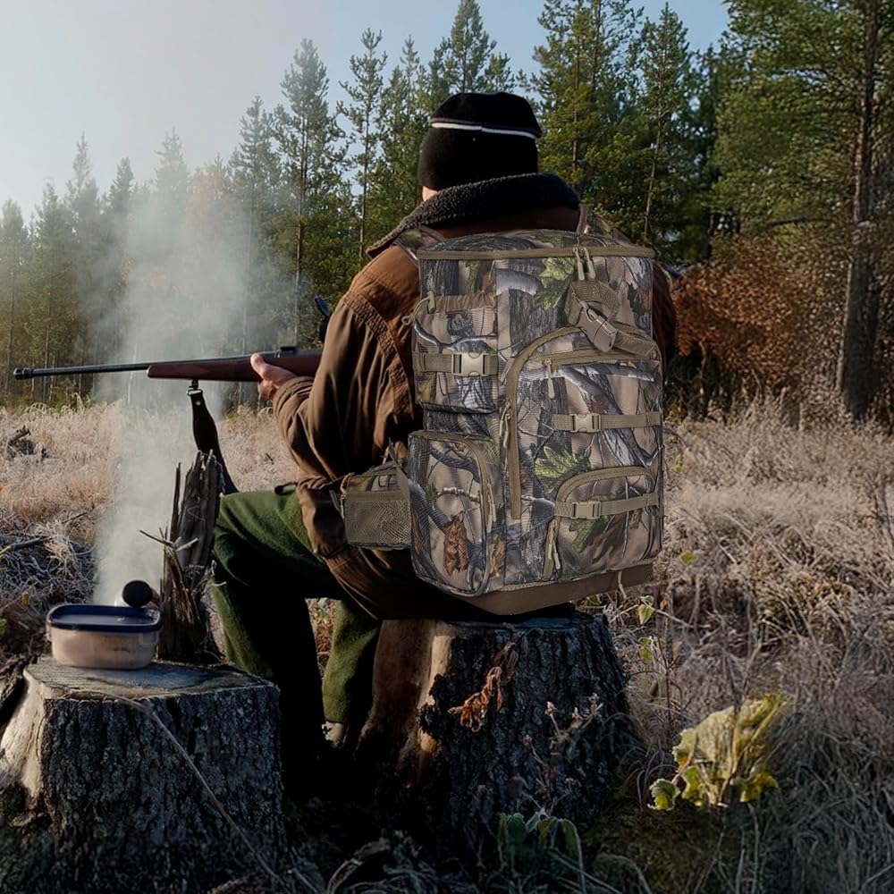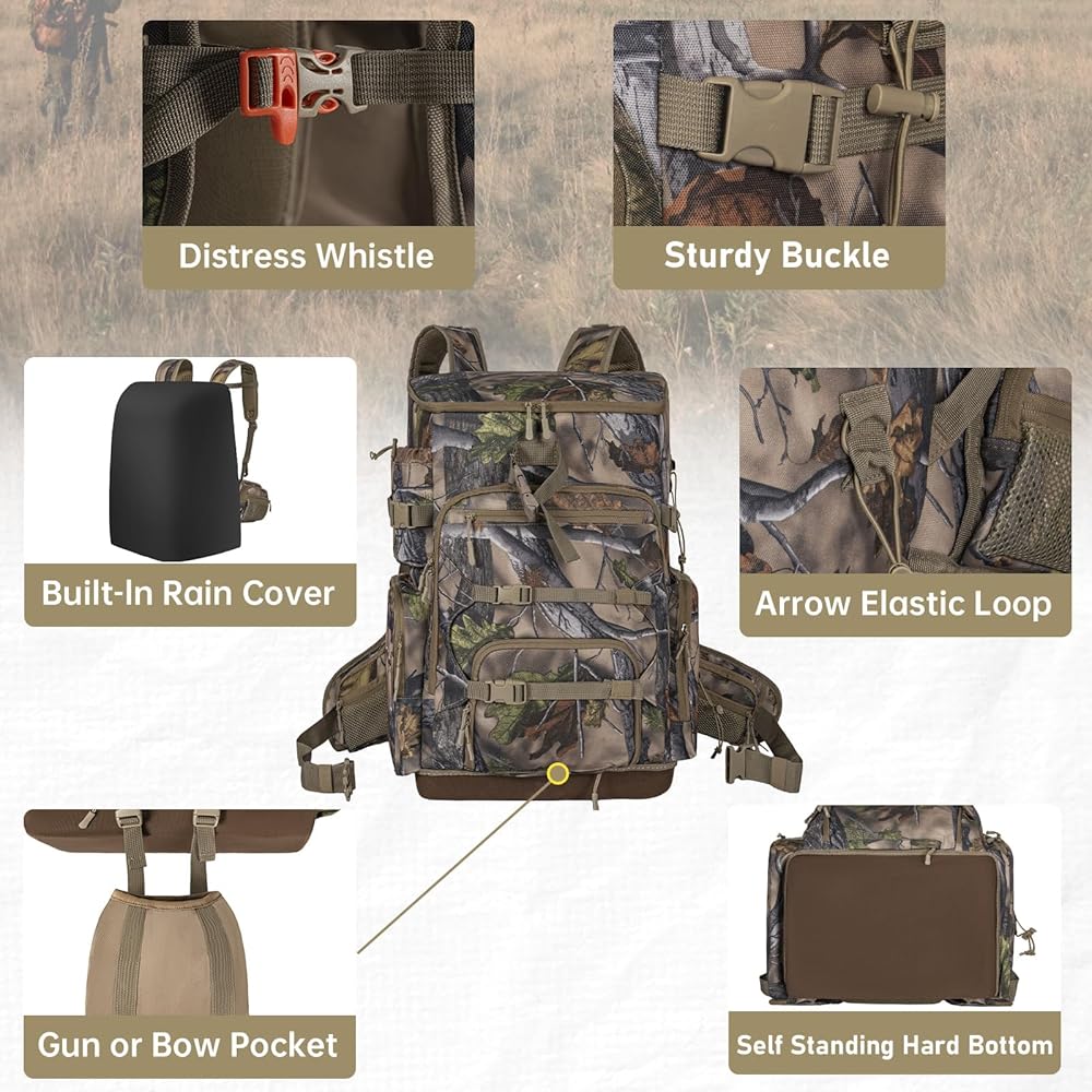 【Ultra-Lurable & Noise-Free Fabric】: Crafted with rugged polyester and reinforced stitching, this hunting backpack resists abrasion, and harsh outdoor elements. The silent, camouflage-friendly fabric ensures you move stealthily