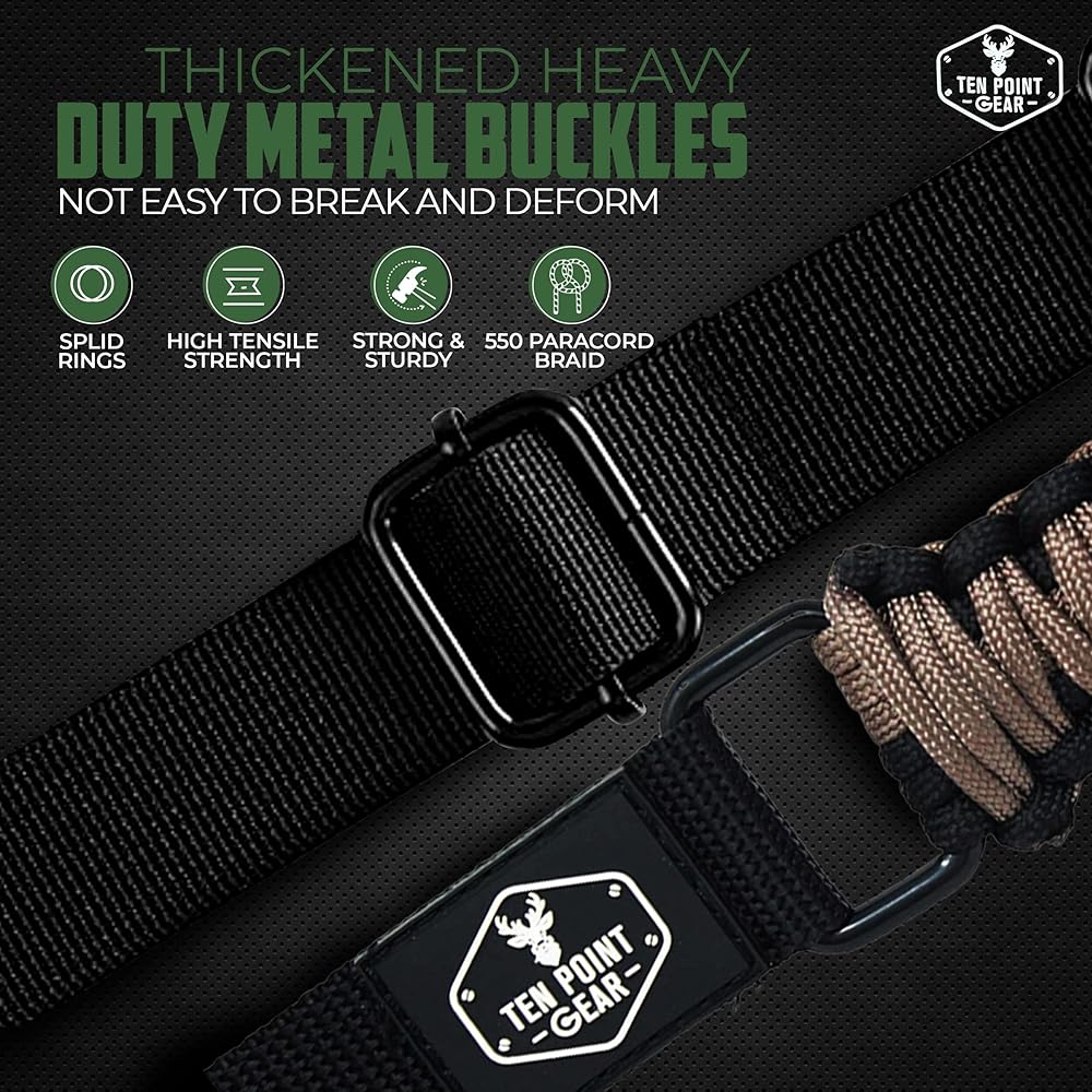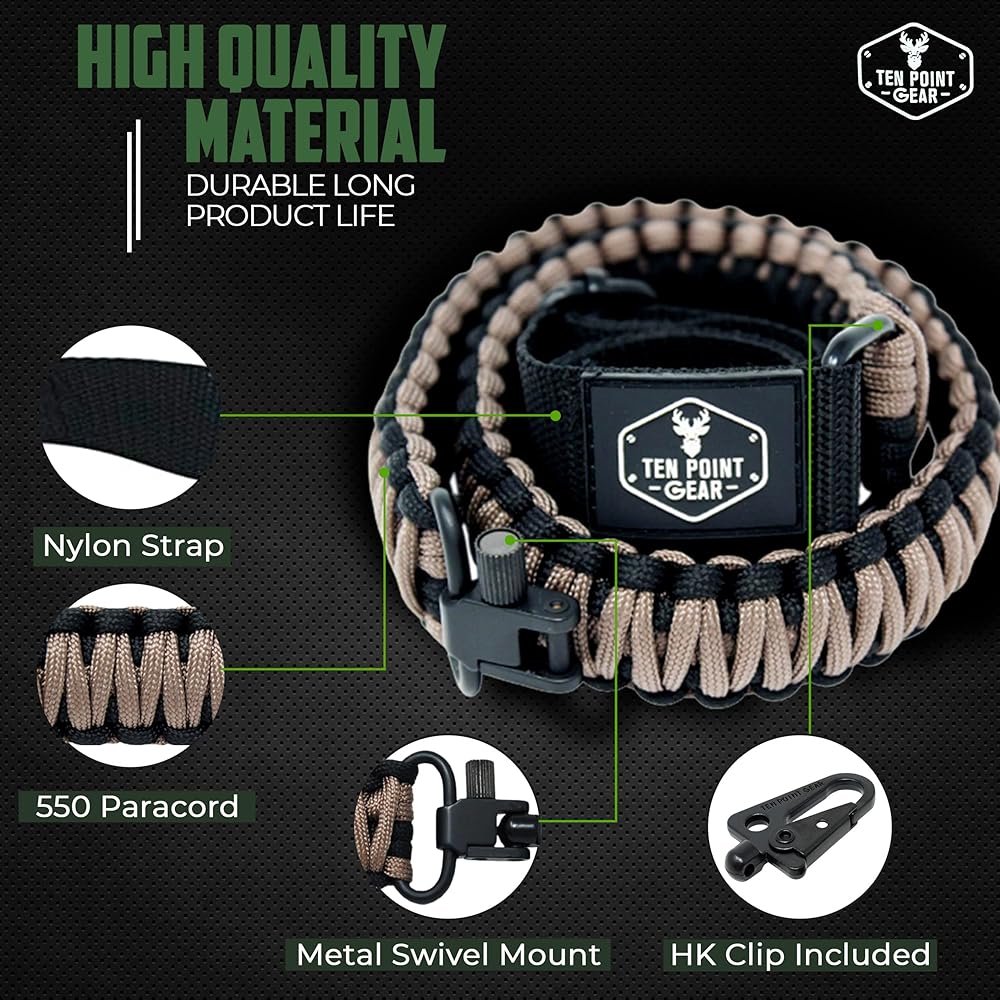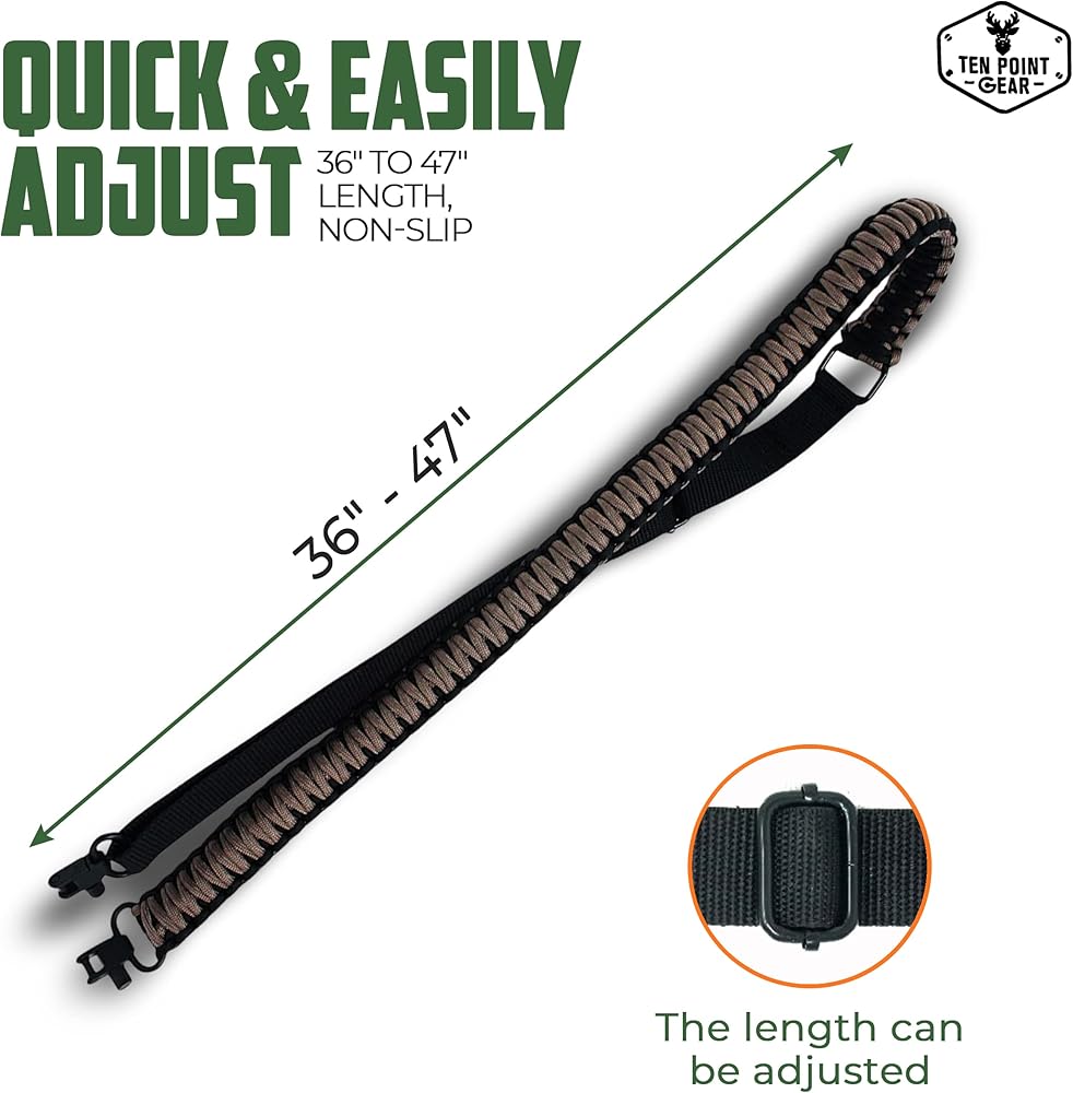 Handmade 550 Paracord 2 point traditional sling with standard swivel connection and clip attachment. Several great-looking color options, all adjustable from 36" to 47". Very lightweight and comfortable. Paracord has hundreds of survival uses, making this sling functional in many ways if necessary. Perfect for use as a rifle sling, shotgun sling, and even a crossbow sling! Looks great on all traditional firearms. All Ten Point Gear Traditional Slings include a clip to attach to standard loop connections. Super easy to quickly attach to swivel mount slings and then to clip D Ring-style. SATISFACTION GUARANTEED - If for any reason you are not happy with these slings we will refund 100%. Simply reach out to us and we will make sure you are fully satisfied with all of our Ten Point Gear products. We are an American Company and stand fully behind everything we sell. We are a top seller for slings and outdoor hunting products. We have thousands of super happy customers from all over the world.