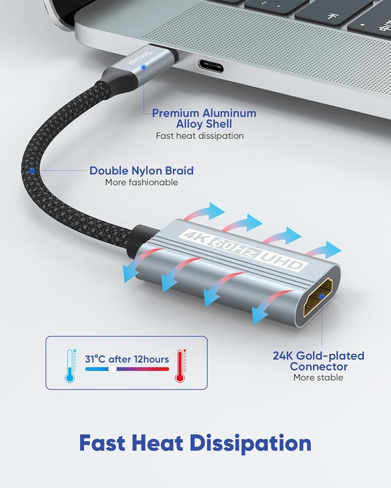 متانة معززة: يتميز غلاف سبائك الألومنيوم الذي تمت ترقيته حديثًا بأداء ممتاز في تبديد الحرارة، والذي يظل أكثر برودة من أغلفة الألومنيوم العادية في ظل الاستخدام الطويل. رقاقة IC متقدمة مدمجة، موصل مطلي بالذهب 24 قيراط مع تصميمات حماية متعددة داخل الكابل يضمن نقل أكثر استقرارًا لمحول HDMI من النوع c