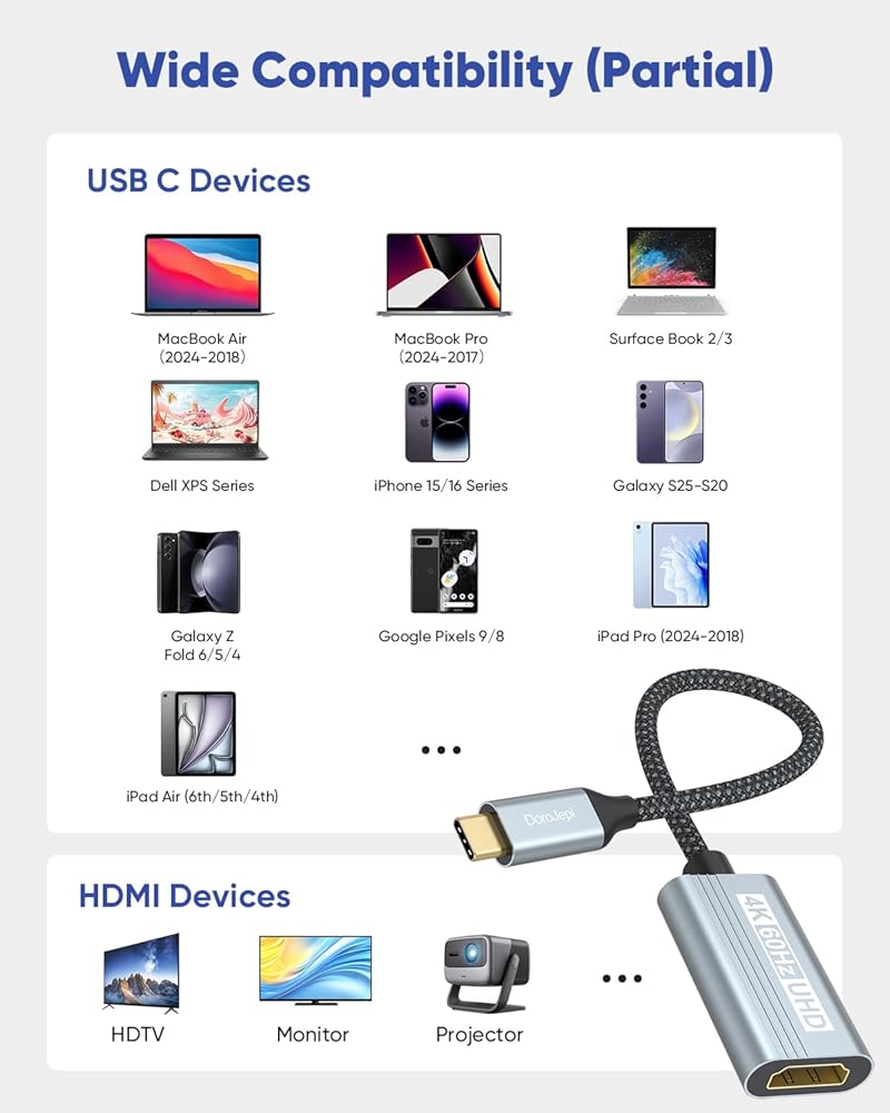 من USB C إلى HDMI: يدعم وضع USB-C DP Alt، وUSB4، وThunderbolt 5/4/3 إلى اتصالات HDMI. تتخصص DoroJepi في إنتاج منتجات متميزة تعزز حياة العمل/الشخصية للعملاء. نحن نقدم خدمة ما بعد البيع والدعم المهني عبر الإنترنت على مدار 24 ساعة