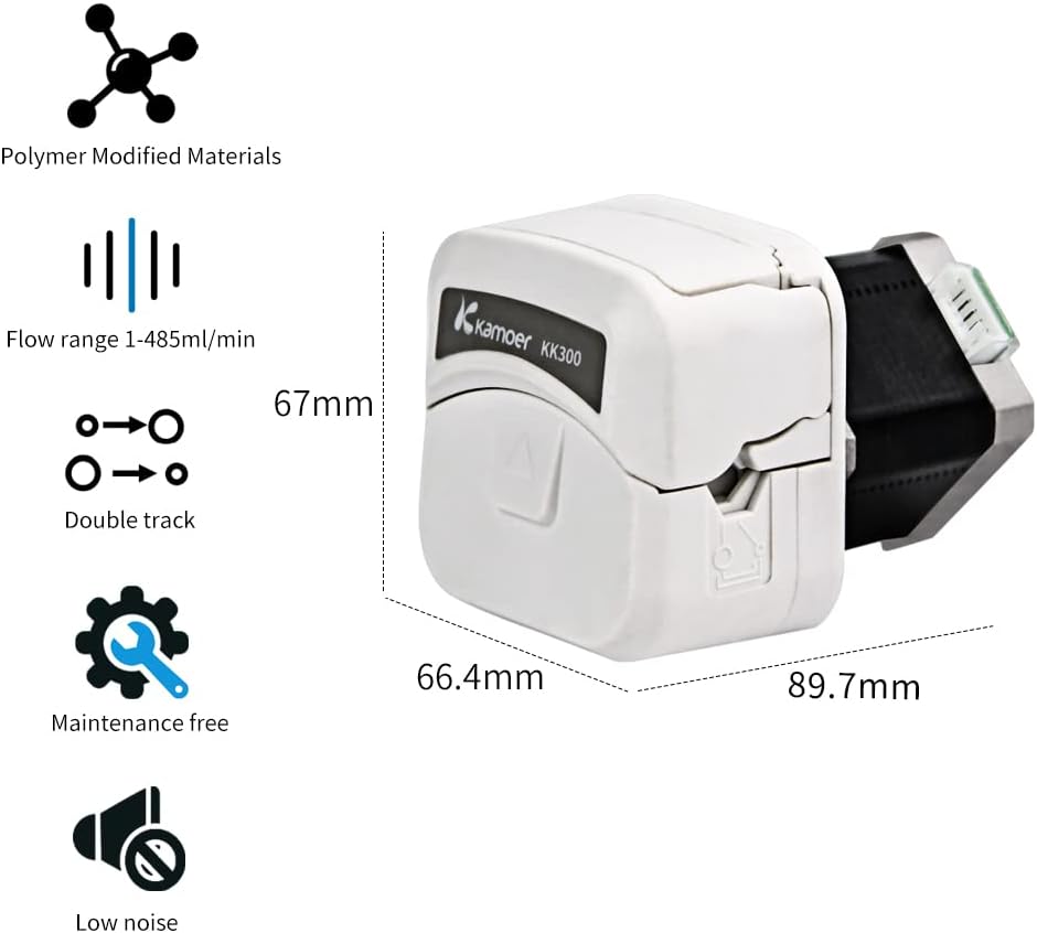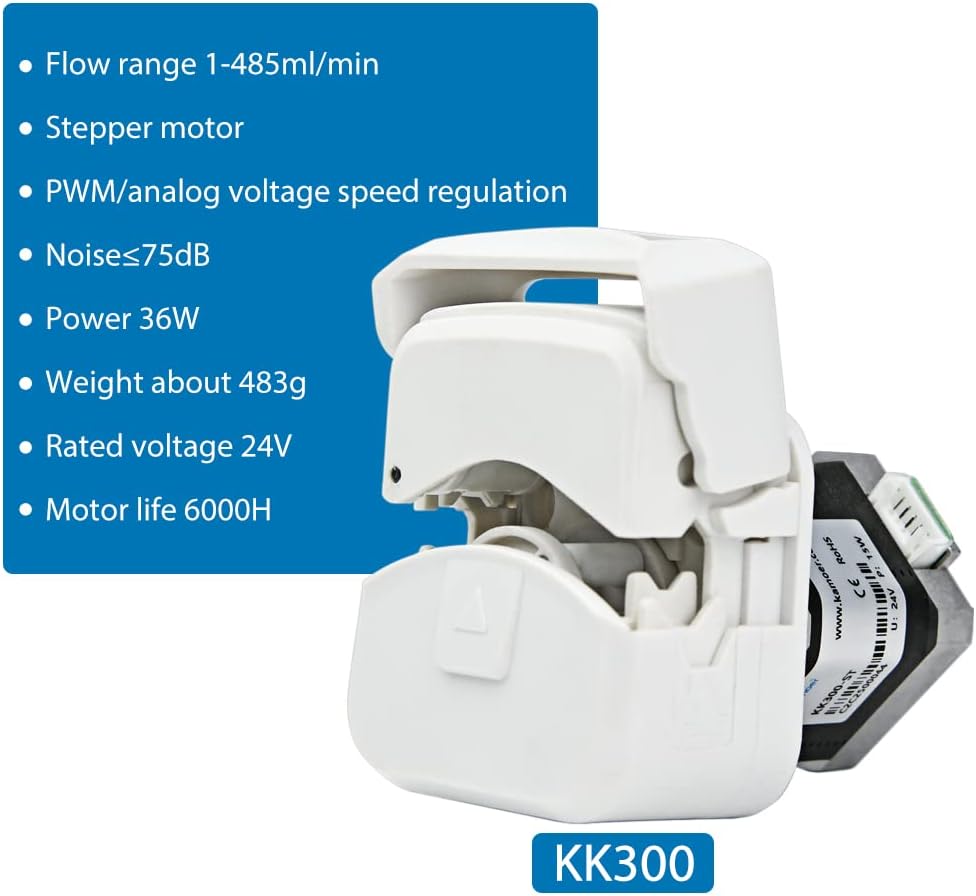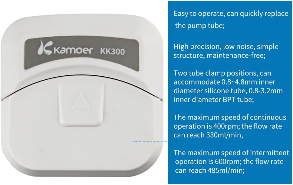 Flow rate range 1~485ml/min. Max speed 400rpm for continuous operation; flow rate up to 330ml/min; Max speed 600rpm for intermittent operation; flow rate up to 485ml/min.