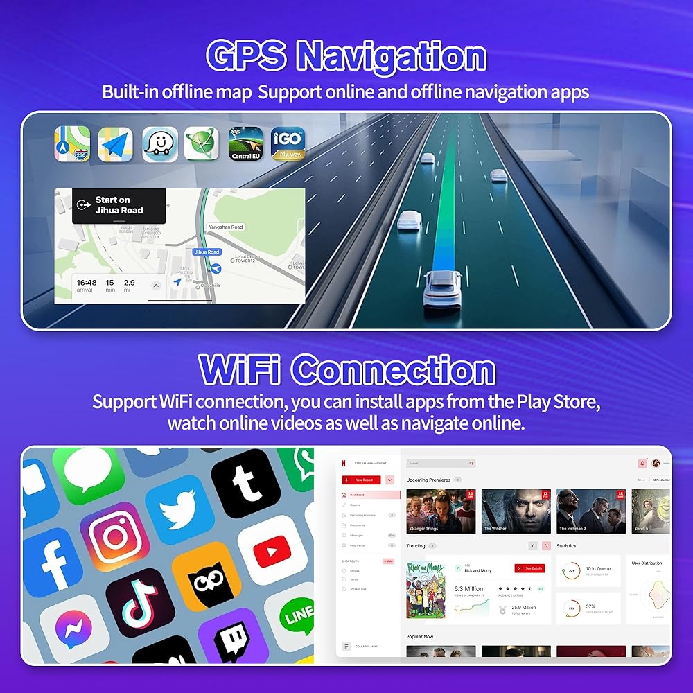 🚘【GPS Navigation & WiFi Connection】Built-in offline map of north america.After internet connection,you can also use online maps for real-time traffic information to make your journey smoother.This car navigation unit supports online/offline navigation.Online maps like waze and navitel are available with wifi or a hotspot.