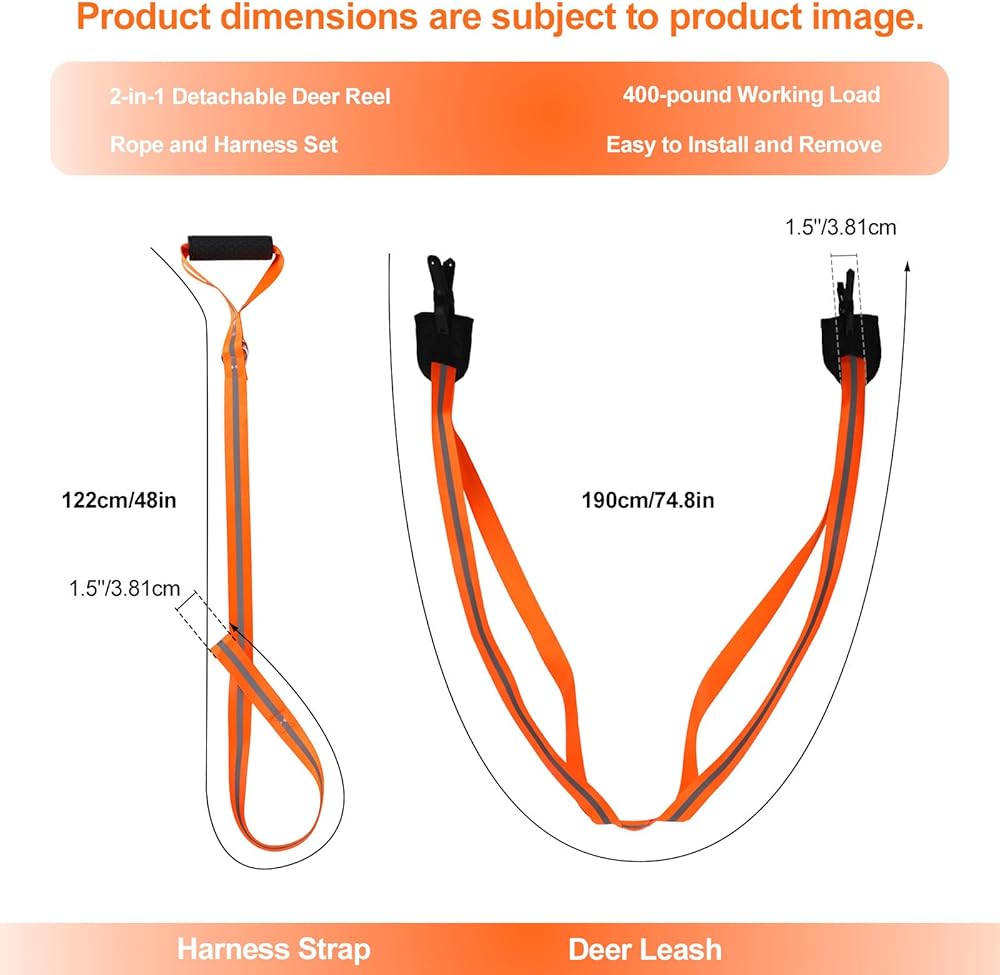 Product Size: The harness strap is 190cm/74.8in in length and the deer strap is 122cm/48in in length, long enough to meet your needs. With a width of 1.5in/3.81cm, the deer drag rope decreases pressure during use.
