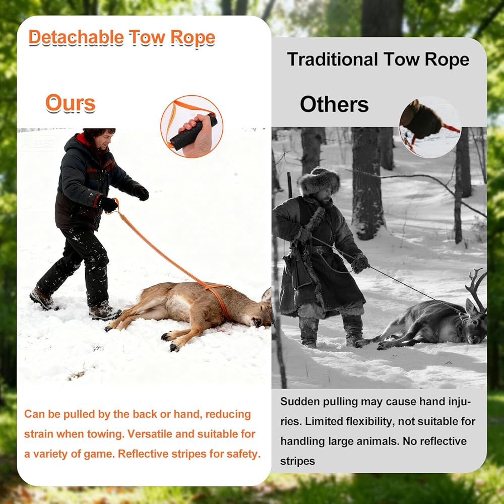 Applicable Occasions: Ideal for dragging deer, boar, bears, and other large game, this versatile deer drag rope is a practical companion for hunting trips. It also supports various outdoor tasks such as endurance training, moving logs, pulling sleds, and transporting other heavy equipment. It makes a thoughtful gift for hunting enthusiasts and outdoor adventurers.