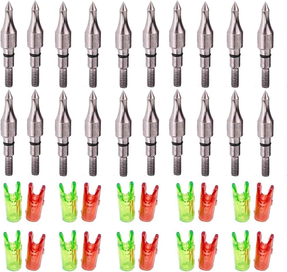 Premium Quality: This set includes 20 steel screw-on arrow points and 40 throat pin nocks, perfect for recurve, compound bows, and crossbows.