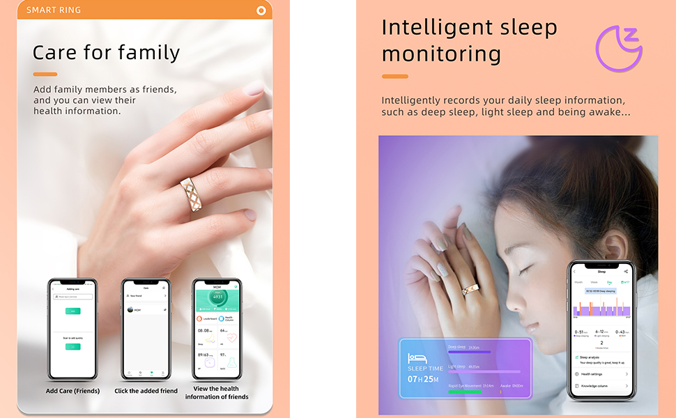 【24/7 Health Tracking】This health tracking ring can 24/7 monitor your heart rate, blood pressure, blood oxygen, sleep and more, serving as your personal health assistant.