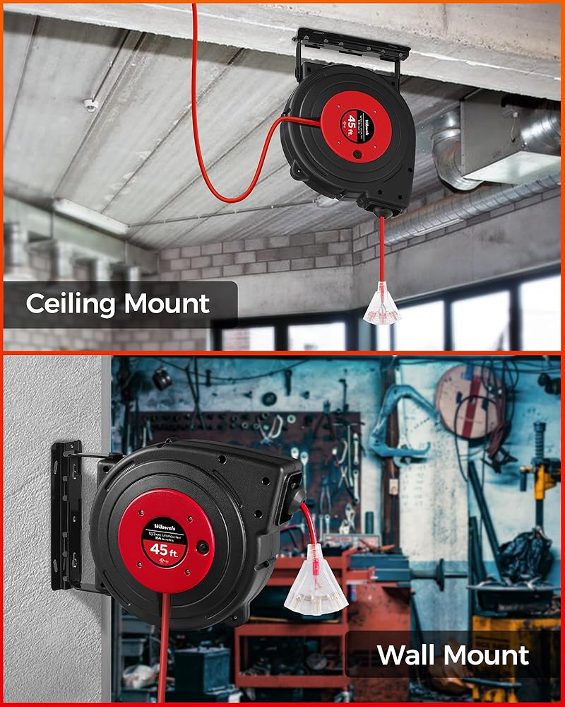 45FT 12/3C Gauge Cord: The 12AWG cord reel has a power rating of 15A/125V/1875W. With a retractable extension cord extends up to 45ft and a 4.5ft lead-in cord, it offers versatility for various power needs and is ideal for garages, studios and warehouses
