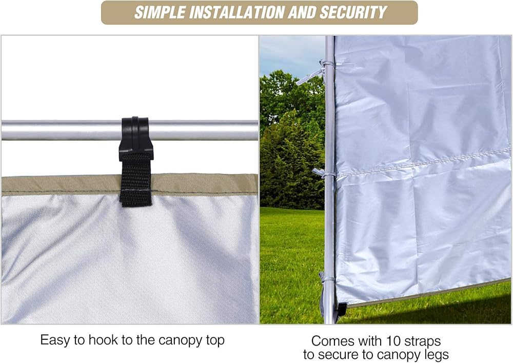 Simple Installation: Comes with 4 plastic truss hooks, making it easy and quick to attach to the canopy roof frame, and 10 side straps to secure to canopy legs. To add extra weather protection to your sunshade
