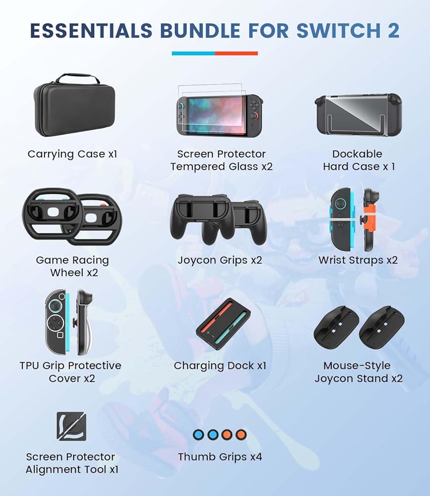 تشتمل مجموعة ملحقات Switch 2 الكاملة على: حقيبة حمل ×1، مقابض الإبهام ×4، عجلة سباق الألعاب ×2، مقابض Joycon ×2، أشرطة معصم ×2، قاعدة شحن ×1، حامل Joycon على شكل فأرة ×2، حافظة صلبة قابلة للإرساء ×1، غطاء حماية بمقبض TPU ×2، واقي شاشة من الزجاج المقسى ×2، أداة محاذاة واقي الشاشة ×1. تعمل ترقية حزمة ملحقات سويتش 2 الكل في واحد على حماية جهاز سويتش 2 الخاص بك، وشحنه بشكل أسرع، والتحكم بشكل أكثر ذكاءً، وإطلاق العنان لإمكانات اللعب الكاملة عبر كل نوع - وهو جاهز لأي مغامرة.