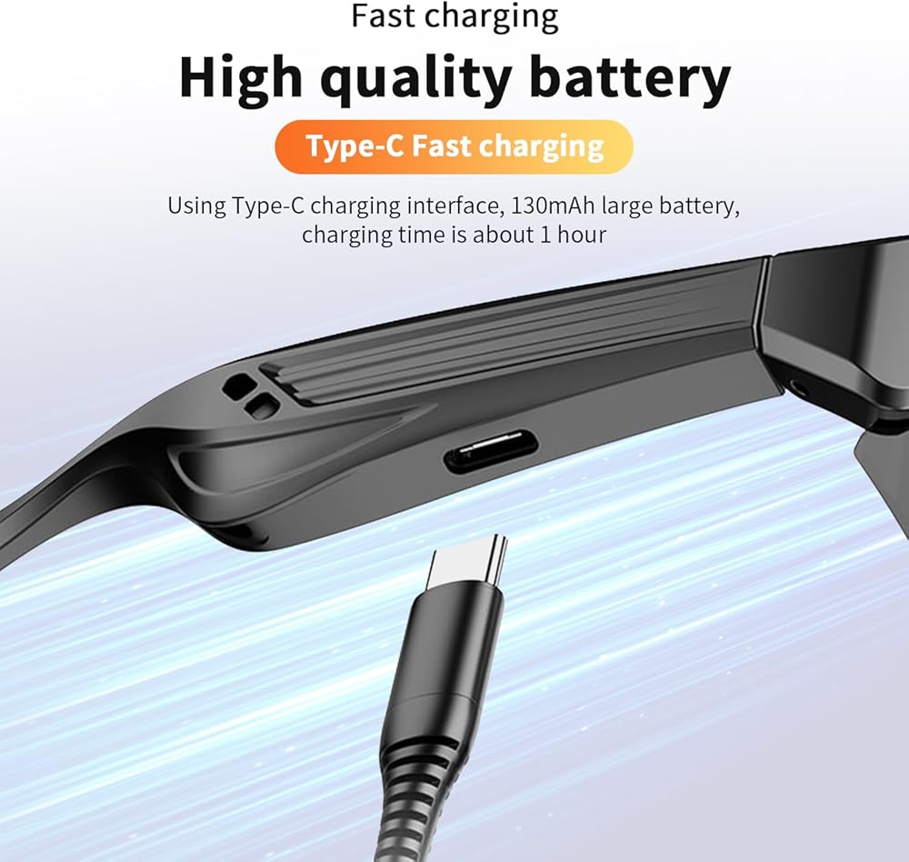 【Long Battery Life】 Bluetooth audio smart glasses with USB-C fast charging port, 130mAh large battery, charging time is about 1 hour, which can support 5 hours of calls, 5 hours of music playback and 50 hours of standby time.