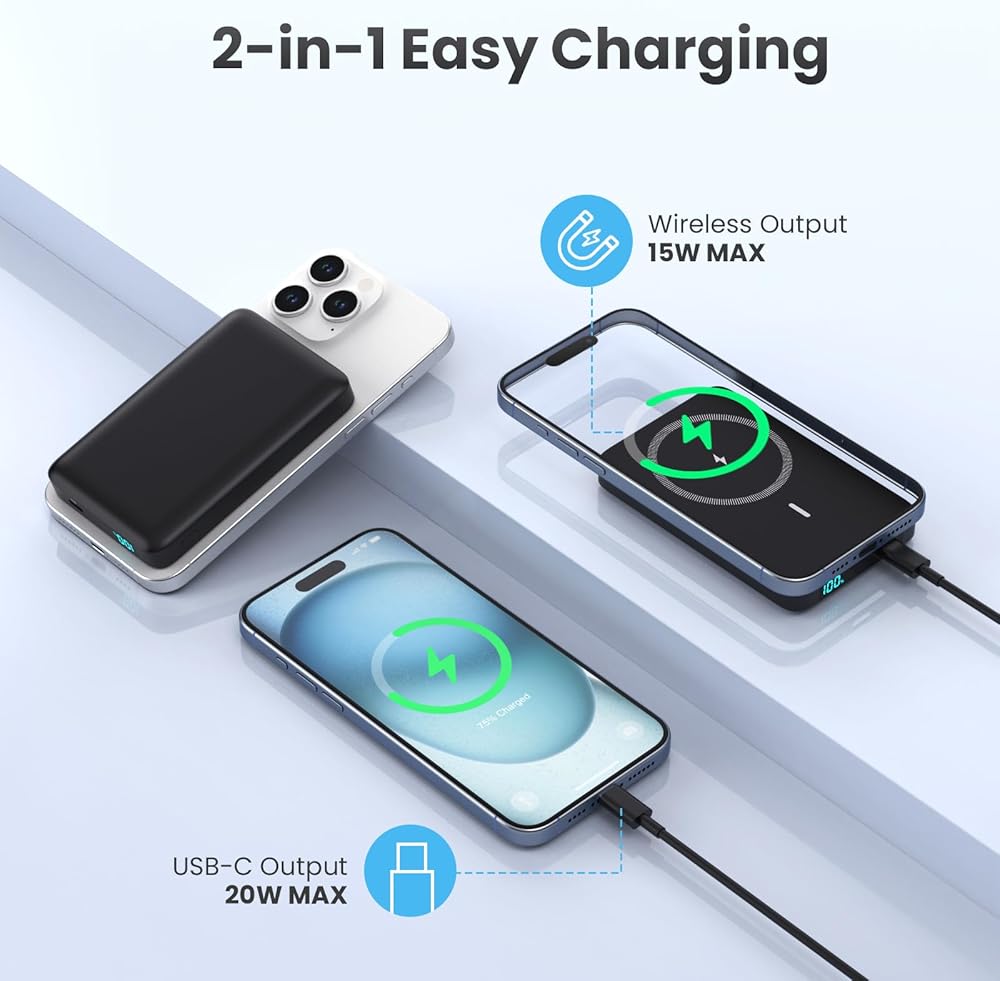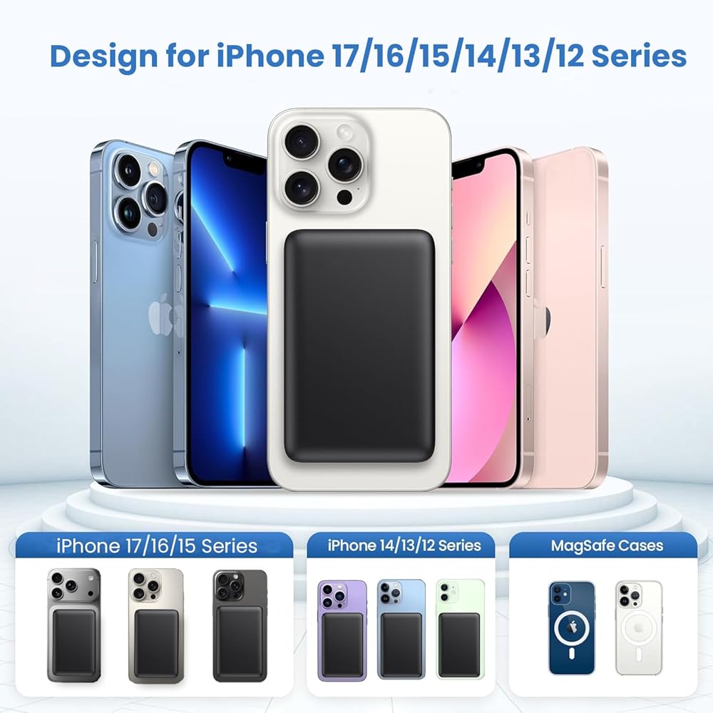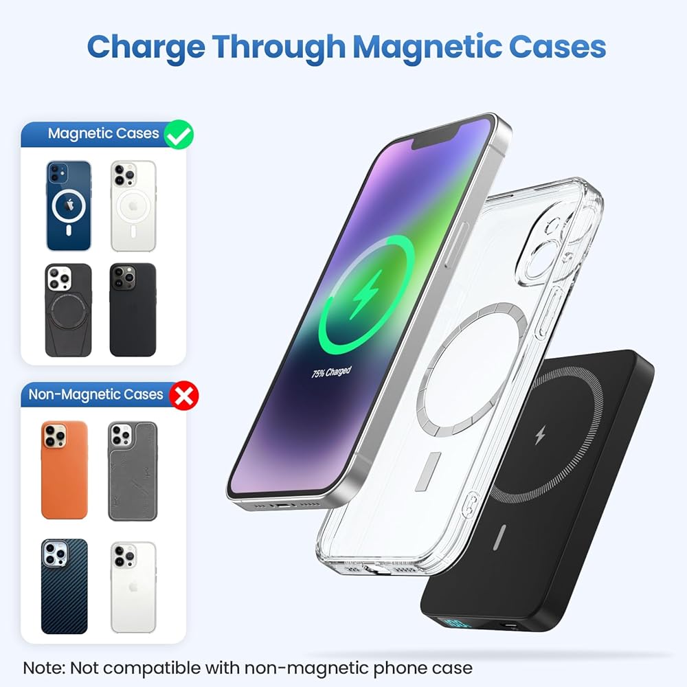 【Magnetic Power Bank for iPhone】Experience the convenience of wireless charging with our advanced wireless power bank. Designed specifically for iPhone 17/16/15/14/13/12 series. Just snap to charge (Note: Works better with MagSafe cases for wireless charging). Cut the cord and free yourself from wall outlets, enjoying uninterrupted charging on the go.