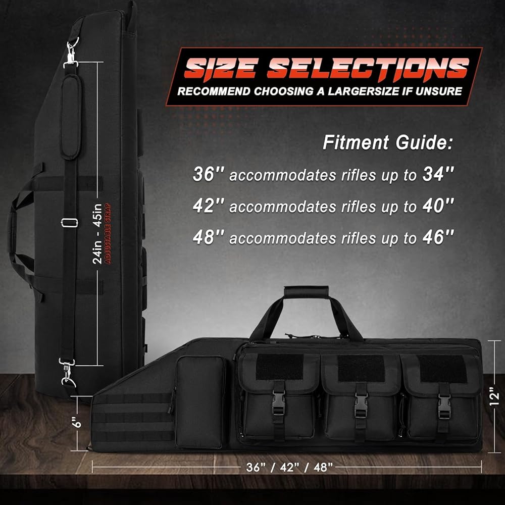 FITS MOST GEARS: Our 48 inch soft rifle bag measures 48‘' x 8.3‘' x 3.2‘' and is designed to fit most 46‘' gears. Please note: The height of this rifle bag may be a little low for some rifles with mounted scopes. This bag is best suited for standard shotguns and rifles or lighter gears. Please consider the size and weight of your gears before purchasing.