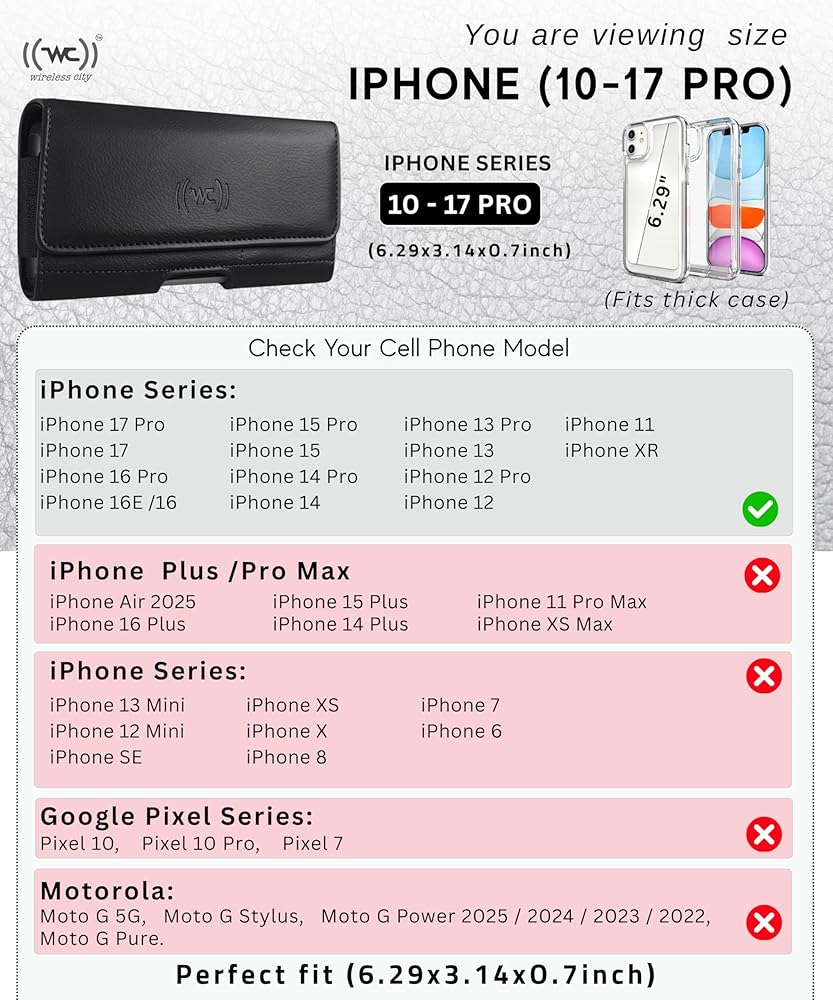 𝐔𝐧𝐢𝐯𝐞𝐫𝐬𝐚𝐥 𝐂𝐨𝐦𝐩𝐚𝐭𝐢𝐛𝐢𝐥𝐢𝐭𝐲: This leather phone holster for men and women fits iPhone 17/16/15/14/13/12/11, 16e, XR, and similar-size devices. Compatible with phone pouches and heavy-duty cases up to 6.29" W × 3.14" H (refer to size chart).