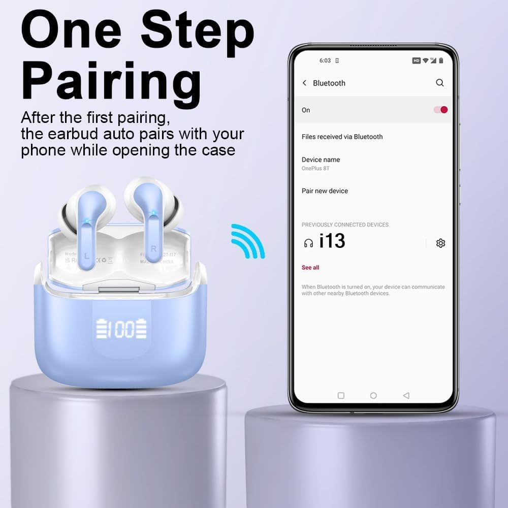 2025 Bluetooth 5.4 Chip with 0.1s Low Latency - Seamless Connectivity: Adopting advanced Bluetooth 5.4, wireless earbud support HSP HFP A2DP AVRCP, which offer you an unparalleled audio experience with faster transmission speed, stronger connection stability, and longer range of bluetooth. Taken from the charging case, bluetooth headphones will be paired with each other automatically, and just hitting on bluetooth list i13 on your device to connect. In a matter of seconds, you are in euphonic music world.