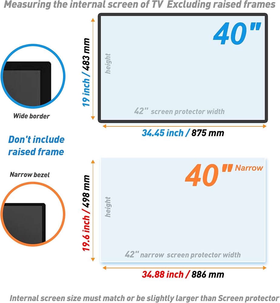 Fits Screen Sizes: Suitable for 40 inch TV screen and 40 inch Narrow bezel TV screen Please be sure to compare the size charts before purchasing to avoid confusion between the two sizes