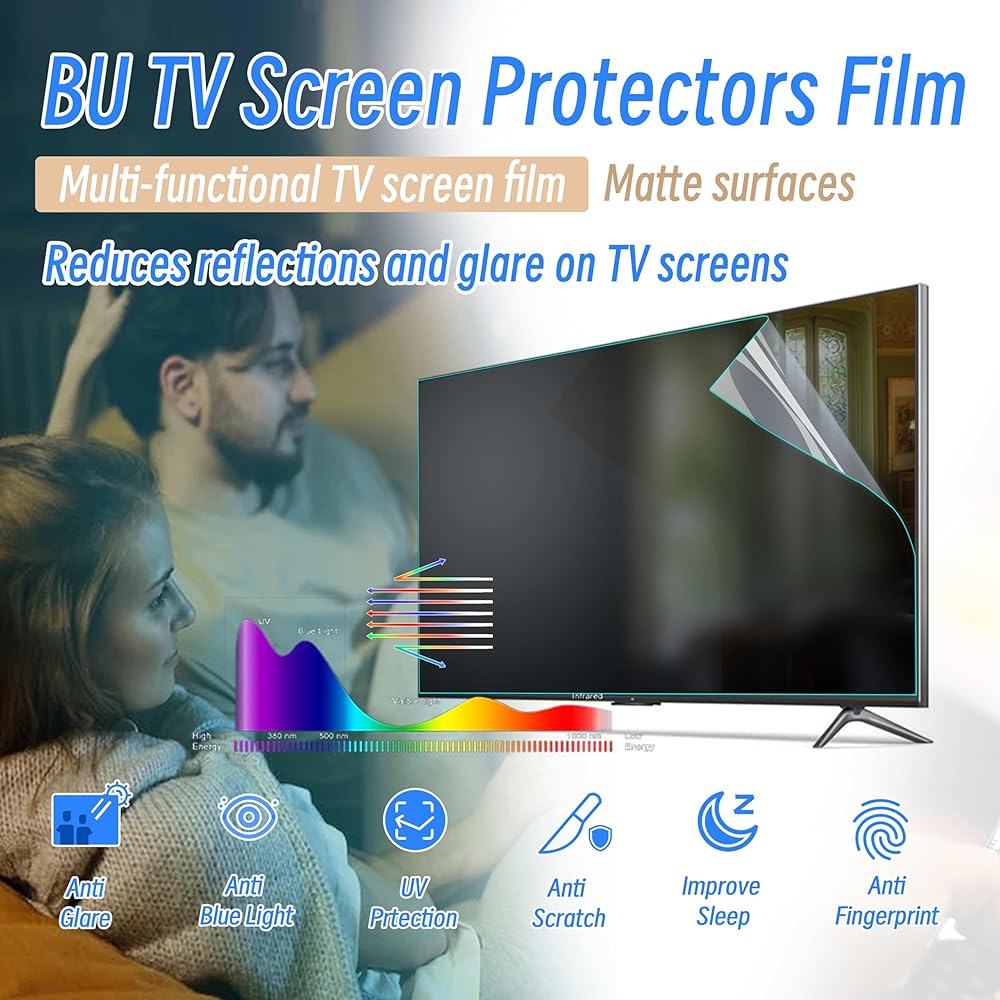 Blue Light Filter for Eye Protection:This TV anti-glare screen protector features a built-in blue light filter, reducing blue light 380nm to 495nm. It helps alleviate eye strain and promotes better sleep,Suitable for prolonged TV viewing