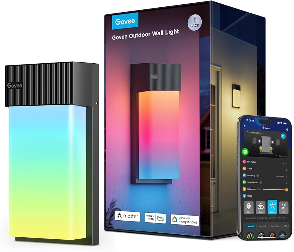Dream-like Lighting Effects: Govee outdoor wall lights can simultaneously display at least 3 colors horizontally. Enjoy a flexible DIY experience and 45 immersive scene modes for creative outdoor decorations.