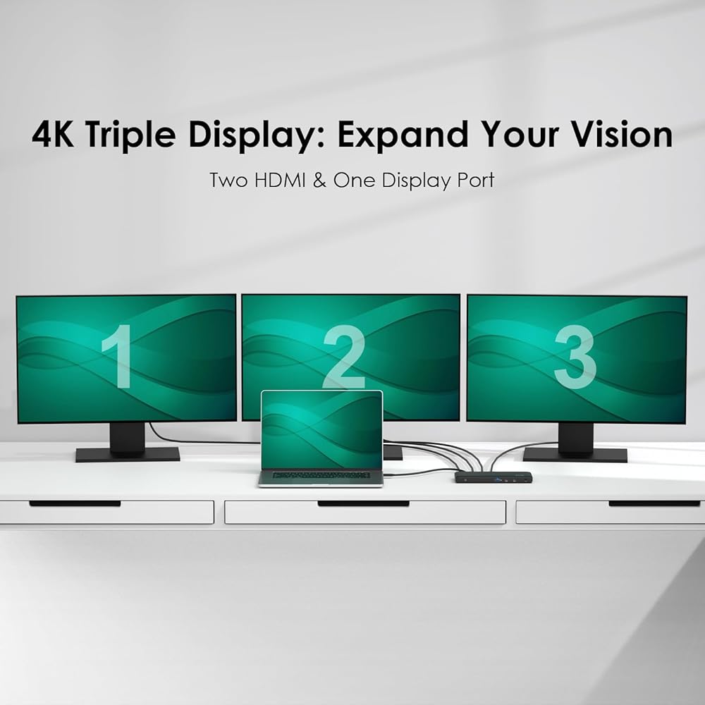 【Single 8K or Triple 4K Display Support】: This docking station powers either a single 8K display port or simultaneously drives three 4K HDMI monitors, maximizing multitasking capabilities and perfectly suited for creative work and professional office applications.
