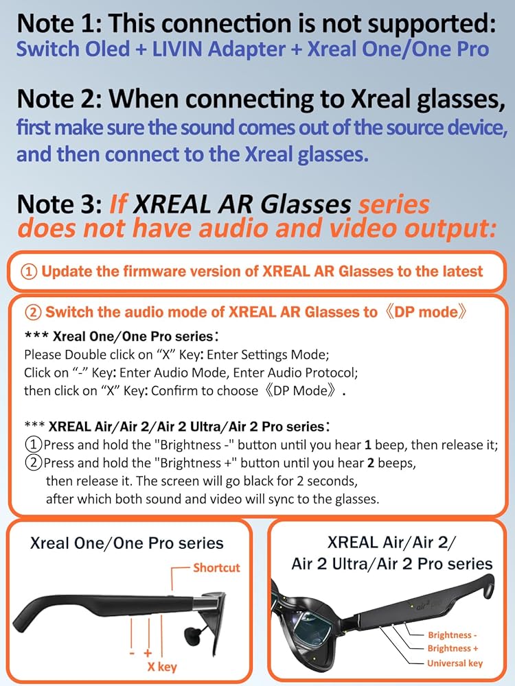 【Note-1:XREAL One and Meta series】: ✅HDMI Male to USB C Female Adapter《Not compatible with all Meta series》✅If 《XREAL One》 has no Audio and video output: 1. Please Double click on “X Key”:Enter Settings Mode, Click on “-” Key:Enter Sound Mode, Enter Audio Protocol, then click on Universal Key:Confirm to choose 《DP Mode》. 2. HDMI output device sound: Select XREAL One.