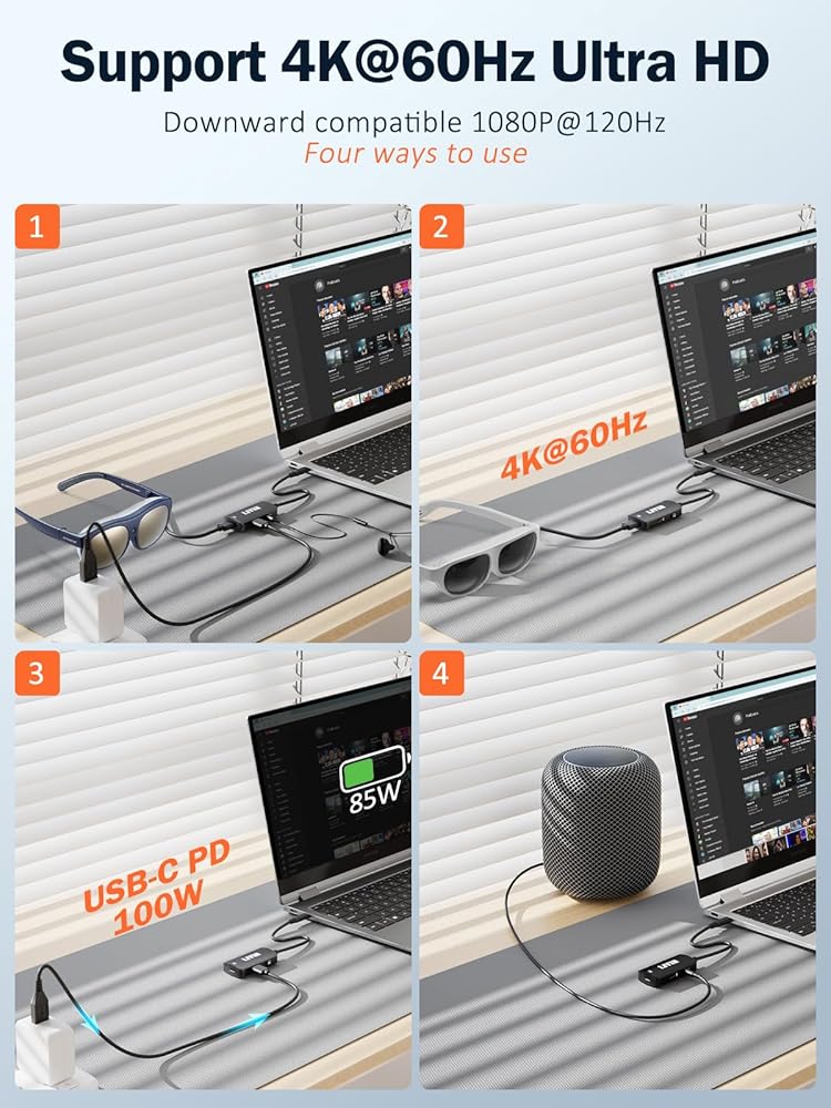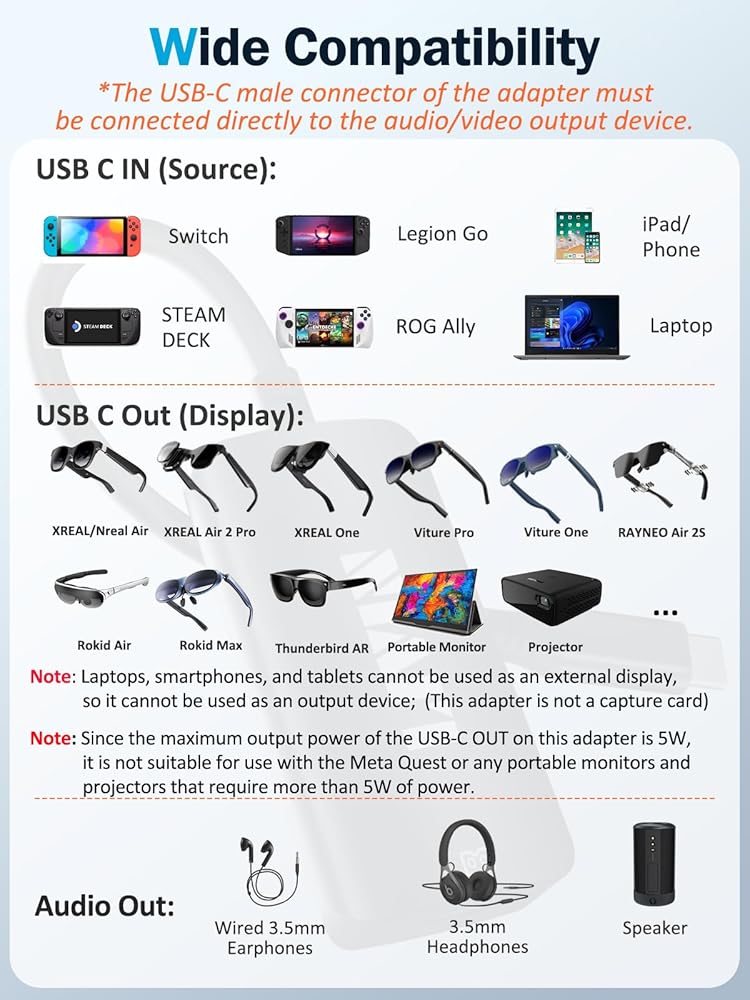 【Strong Compatibility】: HDMI to Type C Compatible with all kinds of smart glasses: ✅ XREAL: XREAL Air/2/2 Pro/One/pro/Ultra, Rokid Air/Max, RayNeo Air 2s XR, Viture Pro/One, Thunderbird AR. ✅ Compatible with Switch, Xbox、PS4/5,、Steam Deck、ROG Ally...... ✅ Compatible with Portable Monitor, USB-C projector, Google TV, Fire TV Stick, etc. ✅ Compatible with computer hosts, laptops, mobile phones, cameras, monitors, MacBook, iMac, iPad, IOS, Android, Windows, Dell, Asus, Huawei, HP, Lenovo and more.