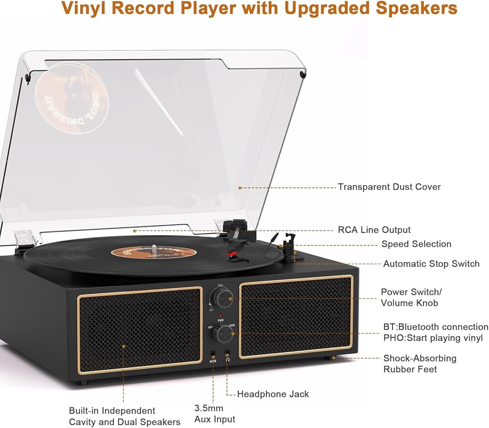 📶【Bluetooth Connectivity & Flexible Input Options】Our record player bluetooth system supports both wireless streaming and wired connections. Pair your phone, tablet, or laptop via Bluetooth, or use AUX input and RCA output for maximum versatility. This vinyl player easily integrates with home theater systems, external speakers, or headphones—making it one of the most flexible record players with speakers available.