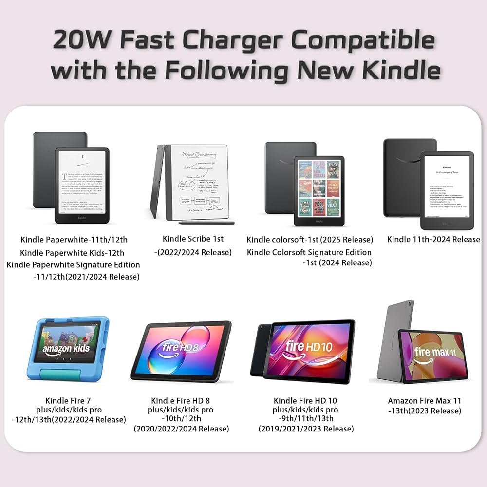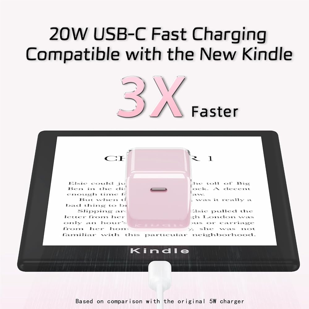 A fresh and vibrant light pink charger adapter with a white cable breaks away from traditional neutral styles. Add a splash of color to your tablet while saving charging time with 20W fast charging. Compatible with: Kindle Paperwhite Signature Edition 32GB-11th 12th, Kindle Paperwhite 16GB-11th 12th (2021 & 2024 Release) Also Compatible with: Fire 7 plus/kids/kids pro-12th/13th(2022/2024 Release); Kindle Fire HD 8 plus/kids/kids pro -10th/12th(2020/2022/2024 Release); Kindle Fire HD 10 plus/kids/kids pro-9th/11th/13th(2019/2021/2023 Release); Amazon Fire Max 11-13th(2023 Release);Kindle 11th-2024 Release; Kindle colorsoft-1st (2025 Release); Kindle Scribe 1st(2022/2024 Release) PLEASE NOTE: USB Type-C Only Compatible with New Kindle. Not applicable to versions prior to 2019.