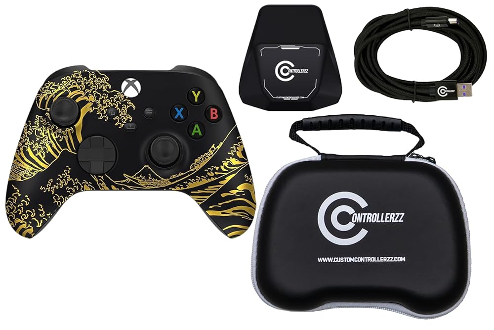 Upgrade your setup with the ultimate all-in-one gaming bundle from Custom Controllerzz. This complete set includes a brand new Golden Waves Custom Wireless Controller for Xbox Series X/S, Xbox One, & PC. Additionally, includes a durable 9ft braided USB-C cable, controller stand, and a universal travel case to keep your controller protected wherever you go or when not in use. Every controller is made from a genuine Microsoft Series X/S controller base, customized with our exclusive custom designs. Whether you're gaming on Xbox Series X/S, Xbox One, or PC, this bundle delivers the comfort, control, and style serious gamers expect. Enjoy tangle-free charging, secure storage, and next-level aesthetics—all in one box. It's everything you need to take your gaming experience to the next level.