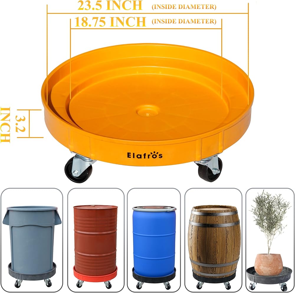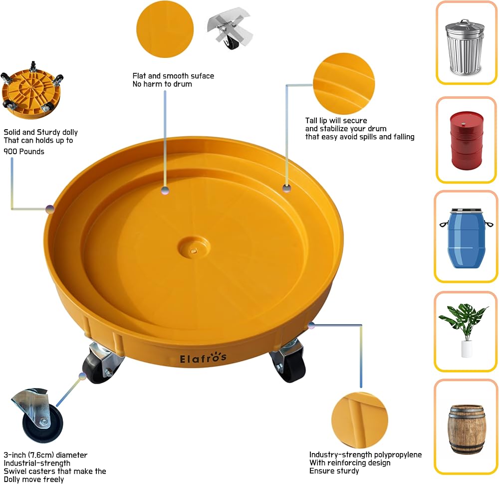 ☑️ SPECIALLY DESIGNED WHEELS: With the help from five 3-inch (7.6cm) diameter industrial-strength polypropylene made wheels, we make it possible for you to effortlessly control the direction of dollies even in narrow spaces. Their engineered design will make your barrel firm and stable during transportation.