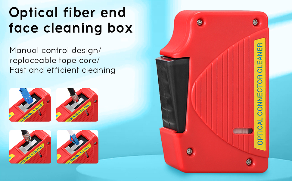 【 Wide cleaning range 】Fiber optic cleaning box: adopting a cartridge style cleaning design, the cleaning tape is exposed by pressing the switch with one hand, and the plug end can be cleaned by gently wiping the end face. It is suitable for cleaning various fiber optic plugs at the SC/FC/ST/LC plug end. After cleaning, the cover will automatically close to prevent the cleaning tape core from being exposed and causing secondary pollution.