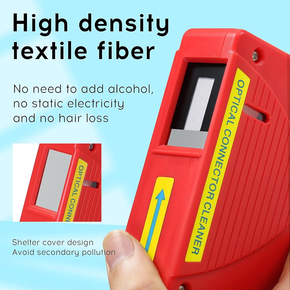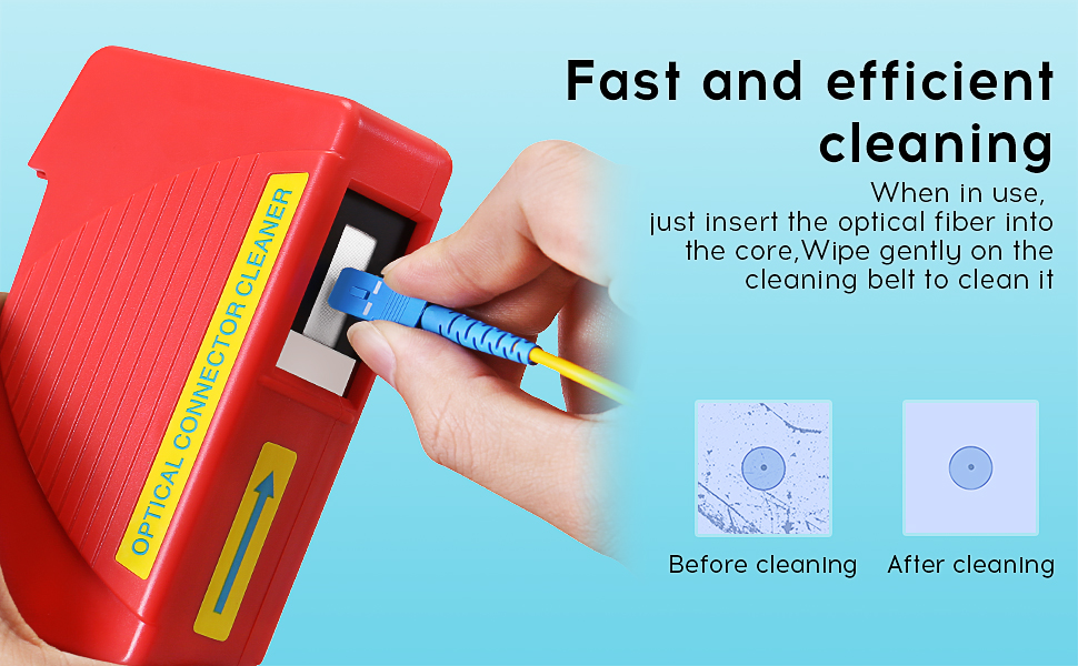【Cleaning effect&cleaning frequency】Fiber optic cleaning pen is made of anti-static resin material, ensuring that the cleaned port does not cause secondary pollution due to electrostatic adsorption and has been cleaned more than 800 times. The cleaning box adopts a replaceable cleaning belt design, and a single cleaning belt can be reused about 550 times. After use, a new cleaning belt can be replaced, significantly reducing long-term usage costs. The cleaning box/pen can effectively remove 99% of stains without the need for alcohol wiping to remove dust, debris, etc. on the end face.