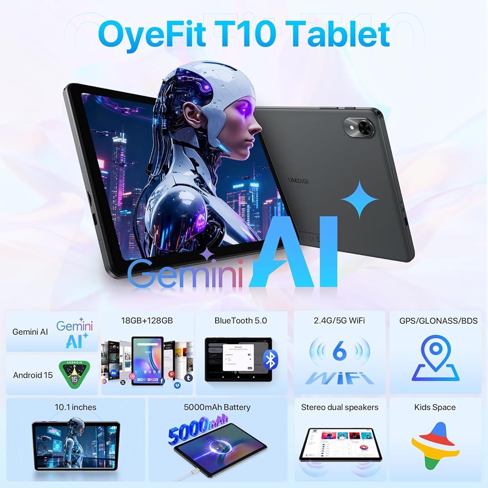 Tablet The World's First Android 15 with Gemini AI,10.1 Inch 18GB RAM 128GB ROM 2TB TF, Speed Up to 2.0 GHZ,Widevine L1,5000mAh,FM Radio,WiFi6, GPS,Bluetooth,Travel Gift,Kids Space,YT Kids