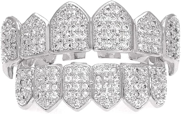 HH Bling Empire Iced Out Diamond Teeth Grillz for Men Women Hip Hop Silver Gold Grills for your teeth Top and Bottom,Rapper Costume Teeth Jewelry and Accessories (Silver)