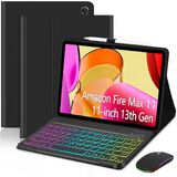 EAMPANG Case with Keyboard for Amazon Fire Max 11 inch (13th Generation, 2023 Release),7 Color Rainbow Backlit Detachable Type-C Charging Keyboard Magnetic Case Pen Holder 13th Gen-Black with Black
