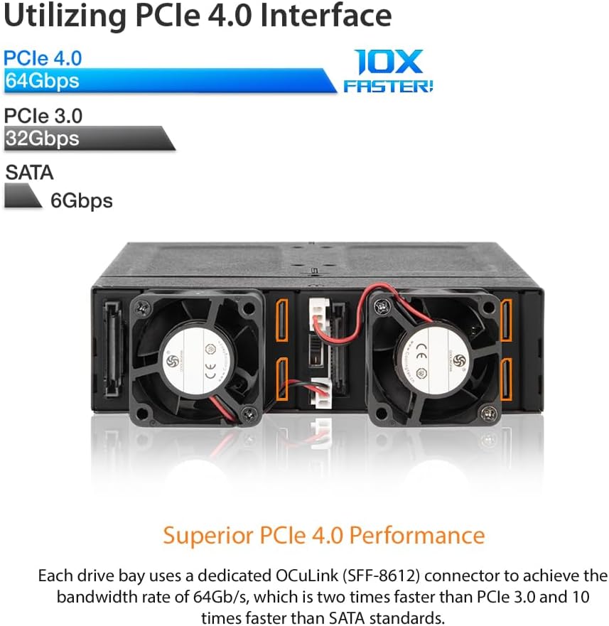 Takes four U.2 NVMe PCIe 4.0 SSD each with 64 Gbps up to 15 mm height