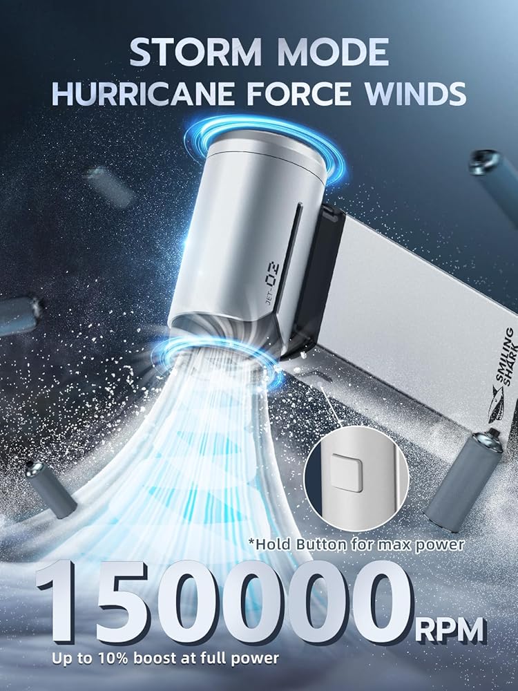 【𝐃𝐮𝐚𝐥-𝐒𝐩𝐞𝐞𝐝 𝐌𝐨𝐭𝐨𝐫 】Smiling Shark J02 Electric Air Duster outperforms traditional canned air with two powerful modes. 𝐌𝐚𝐧𝐮𝐚𝐥 𝐌𝐨𝐝𝐞 𝐨𝐟𝐟𝐞𝐫𝐬 𝟑 𝐬𝐩𝐞𝐞𝐝 𝐥𝐞𝐯𝐞𝐥𝐬 𝐮𝐩 𝐭𝐨 𝟏𝟑𝟎,𝟎𝟎𝟎𝐑𝐏𝐌 for versatile cleaning, while 𝐒𝐭𝐨𝐫𝐦 𝐌𝐨𝐝𝐞 𝐝𝐞𝐥𝐢𝐯𝐞𝐫𝐬 𝐚 𝐛𝐨𝐨𝐬𝐭 𝐭𝐨 𝟏𝟓𝟎,𝟎𝟎𝟎𝐑𝐏𝐌 (and an 𝐞𝐱𝐭𝐫𝐚 𝟏𝟎% 𝐰𝐡𝐞𝐧 𝐟𝐮𝐥𝐥𝐲 𝐜𝐡𝐚𝐫𝐠𝐞𝐝) for maximum power. Simply long-press the button to engage Storm Mode.
