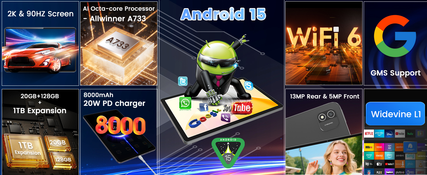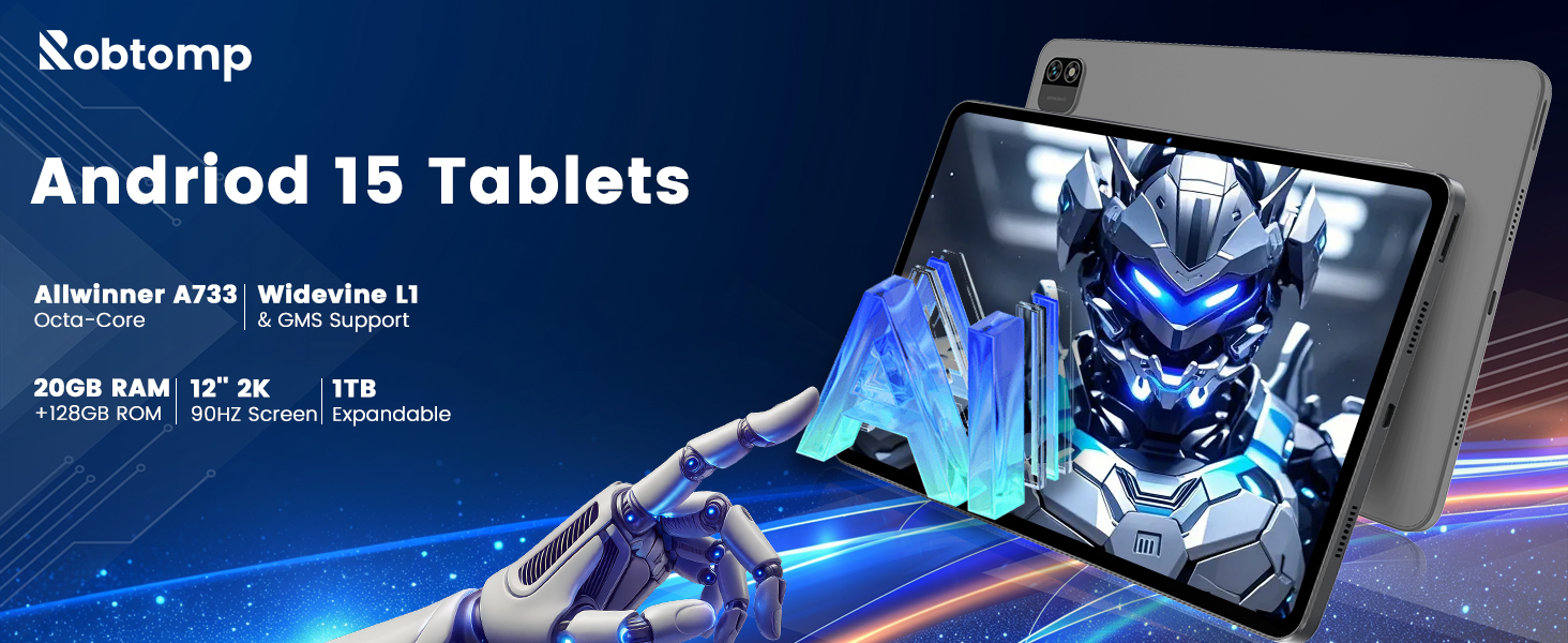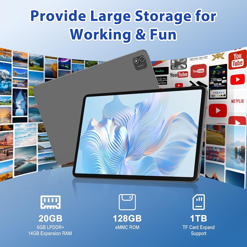 【Powerful Performance - 20GB RAM & Octa-Core AI Chip】Equipped with an Allwinner A733 Octa-Core processor (2x A76 @ 2.0GHz + 6x A55 @ 1.75GHz), the tablet enables seamless multitasking. Open multiple apps simultaneously, switch between them effortlessly, and experience no lag. With 20GB total RAM (6GB LPDDR + 14GB extended), this tablet handles multitasking, gaming, and productivity with ease. Store all your apps, photos, and files with 128GB built-in storage, expandable up to 1TB.
